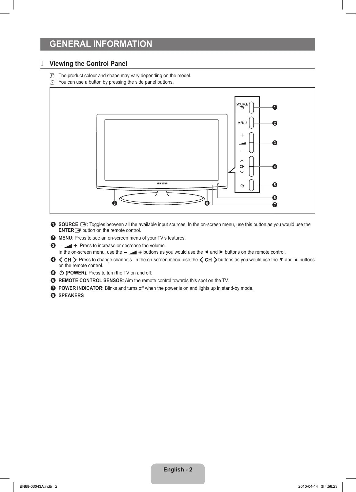 - ■■Specifications One-Touch Button TOOLS Button Press GENERAL INFORMATION ¦¦ Viewing the Control Panel NN The product colour and shape may vary depending on the model. NN You can use a button by pressing the side panel buttons. p. 33