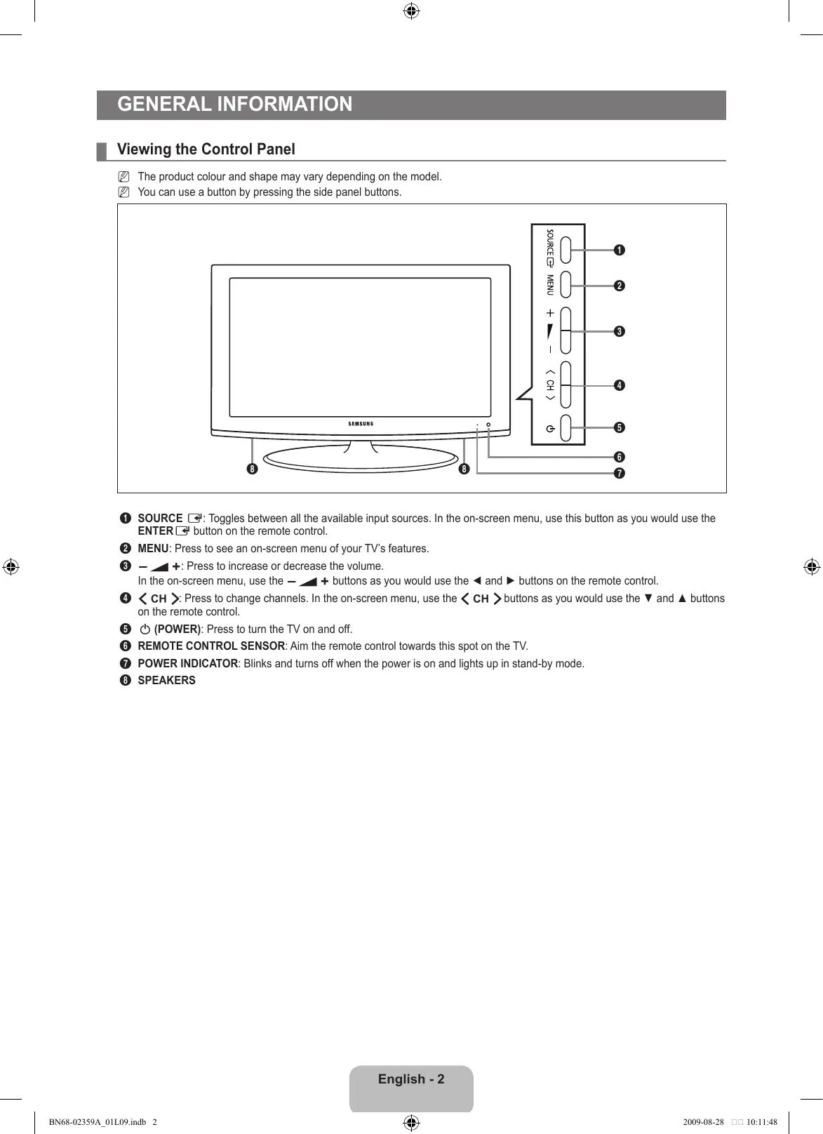 - ■ Specifications One-Touch Button TOOLS Button Press GENERAL INFORMATION ¦ Viewing the Control Panel N The product colour and shape may vary depending on the model. N You can use a button by pressing the side panel buttons. p. 33