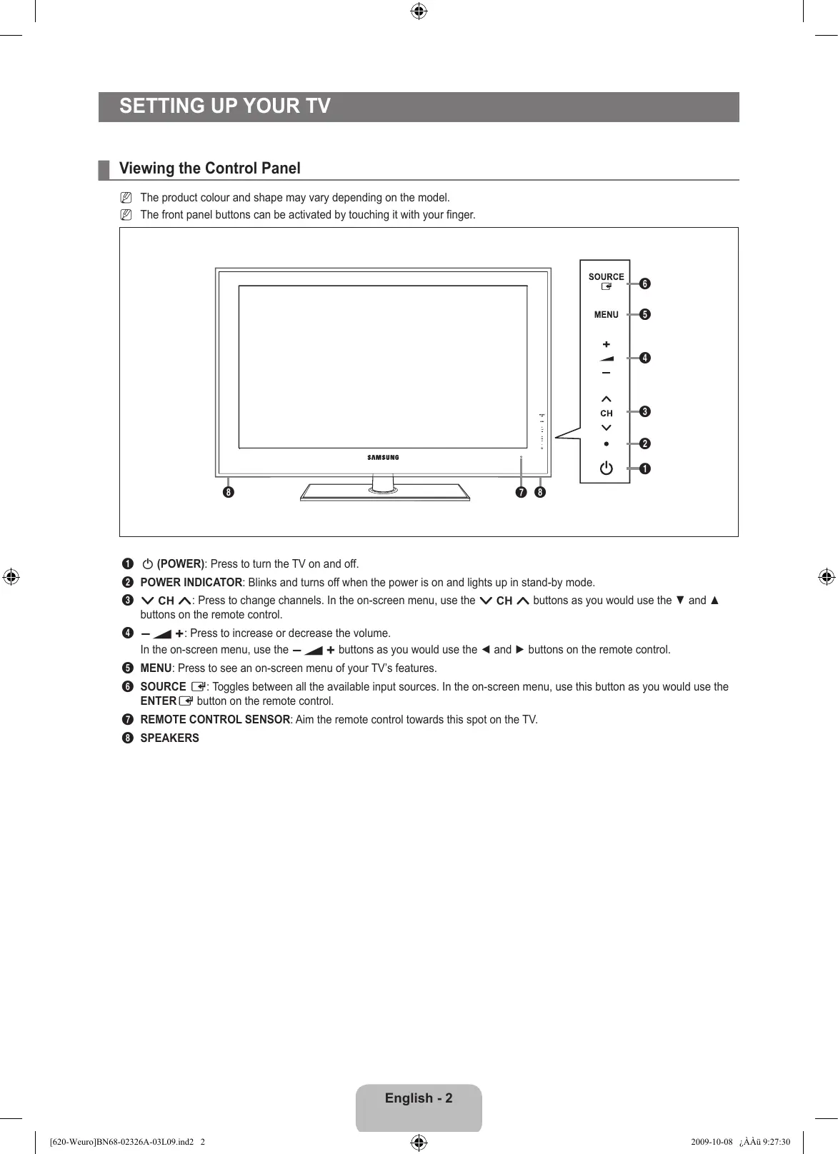 Note One-Touch Button TOOLS Button Press Setting up Your TV ¦ Viewing the Control Panel N The product colour and shape may vary depending on the model. N The front panel buttons can be activated by touching it with your finger.
