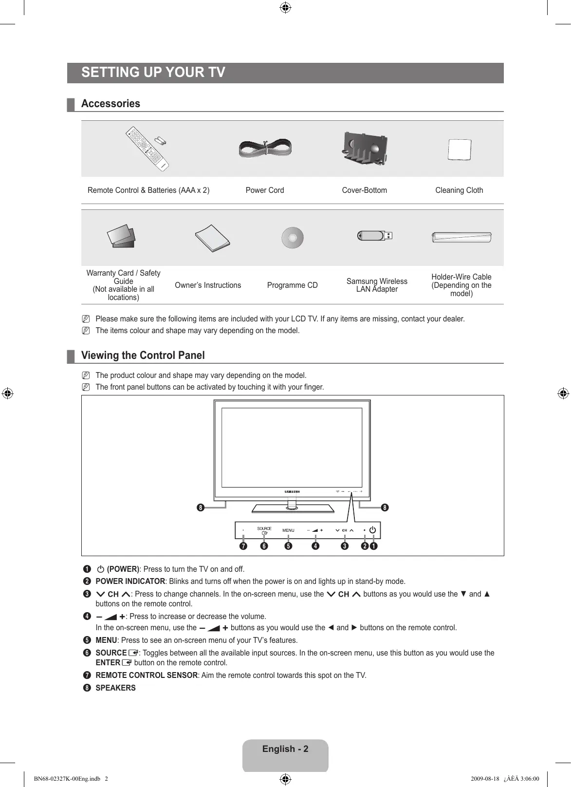 Note One-Touch Button TOOLS Button Press English - BN68-02327K-00Eng.indb 1 2009-08-18 ¿ÀÈÄ 3:05:59 Setting up Your TV ¦ Accessories Remote Control & Batteries (AAA x 2) Warranty Card / Safety Guide (Not available in all locations) Power Cord Owner’s Instructions Cover-Bottom Programme CD Samsung Wireless LAN Adapter Cleaning Cloth Holder-Wire Cable (Depending on the model) N Please make sure the following items are included with your LCD TV. If any items are missing, contact your dealer. N The items colour and shape may vary depending on the model. ¦ Viewing the Control Panel N The product colour and shape may vary depending on the model. N The front panel buttons can be activated by touching it with your finger.