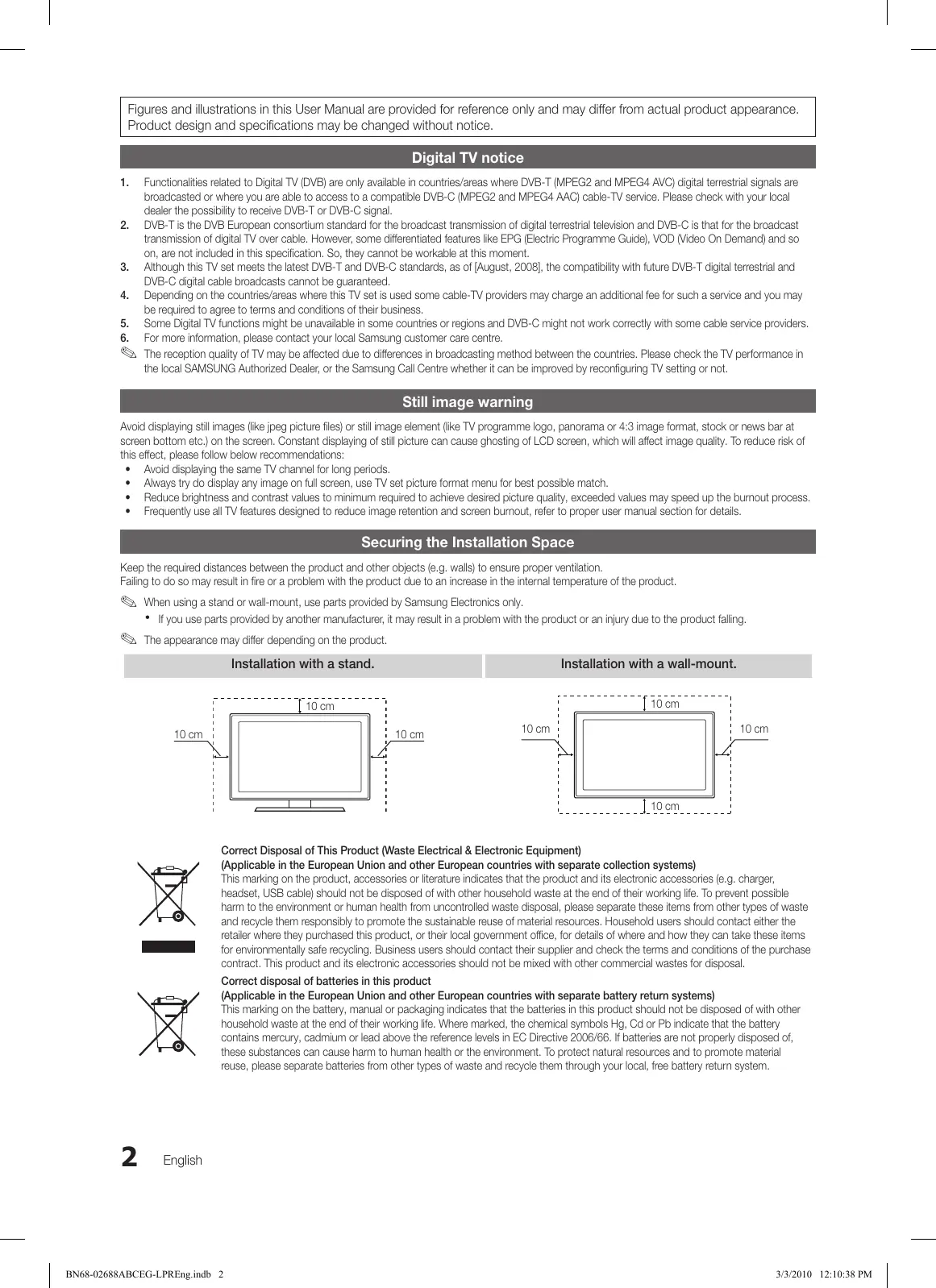 - Frequently use all TV features designed to reduce image retention and screen burnout, refer to proper user manual section for details. Securing the Installation Space Keep the required distances between the product and other objects (e.g. walls) to ensure proper ventilation. Failing to do so may result in fire or a problem with the product due to an increase in the internal temperature of the product. ✎✎ When using a stand or wall-mount, use parts provided by Samsung Electronics only. xx If you use parts provided by another manufacturer, it may result in a problem with the product or an injury due to the product falling. ✎✎ The appearance may differ depending on the product. Installation with a stand. Installation with a wall-mount. 10 cm 10 cm 10 cm 10 cm 10 cm 10 cm 10 cm Correct Disposal of This Product (Waste Electrical & Electronic Equipment) (Applicable in the European Union and other European countries with separate collection systems) This marking on the product, accessories or literature indicates that the product and its electronic accessories (e.g. charger, headset, USB cable) should not be disposed of with other household waste at the end of their working life. To prevent possible harm to the environment or human health from uncontrolled waste disposal, please separate these items from other types of waste and recycle them responsibly to promote the sustainable reuse of material resources. Household users should contact either the retailer where they purchased this product, or their local government office, for details of where and how they can take these items for environmentally safe recycling. Business users should contact their supplier and check the terms and conditions of the purchase contract. This product and its electronic accessories should not be mixed with other commercial wastes for disposal. Correct disposal of batteries in this product (Applicable in the European Union and other European countries with separate battery return systems) This marking on the battery, manual or packaging indicates that the batteries in this product should not be disposed of with other household waste at the end of their working life. Where marked, the chemical symbols Hg, Cd or Pb indicate that the battery contains mercury, cadmium or lead above the reference levels in EC Directive 2006/66. If batteries are not properly disposed of, these substances can cause harm to human health or the environment. To protect natural resources and to promote material reuse, please separate batteries from other types of waste and recycle them through your local, free battery return system.