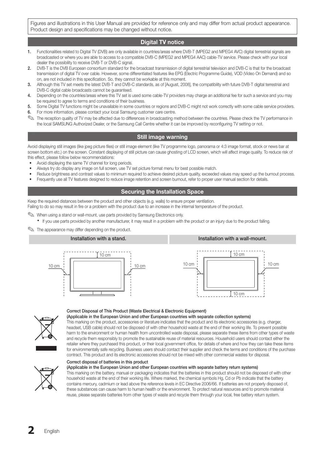 - Frequently use all TV features designed to reduce image retention and screen burnout, refer to proper user manual section for details. Securing the Installation Space Keep the required distances between the product and other objects (e.g. walls) to ensure proper ventilation. Failing to do so may result in fire or a problem with the product due to an increase in the internal temperature of the product. ✎✎ When using a stand or wall-mount, use parts provided by Samsung Electronics only. xx If you use parts provided by another manufacturer, it may result in a problem with the product or an injury due to the product falling. ✎✎ The appearance may differ depending on the product. Installation with a stand. Installation with a wall-mount. 10 cm 10 cm 10 cm 10 cm 10 cm 10 cm 10 cm Correct Disposal of This Product (Waste Electrical & Electronic Equipment) (Applicable in the European Union and other European countries with separate collection systems) This marking on the product, accessories or literature indicates that the product and its electronic accessories (e.g. charger, headset, USB cable) should not be disposed of with other household waste at the end of their working life. To prevent possible harm to the environment or human health from uncontrolled waste disposal, please separate these items from other types of waste and recycle them responsibly to promote the sustainable reuse of material resources. Household users should contact either the retailer where they purchased this product, or their local government office, for details of where and how they can take these items for environmentally safe recycling. Business users should contact their supplier and check the terms and conditions of the purchase contract. This product and its electronic accessories should not be mixed with other commercial wastes for disposal. Correct disposal of batteries in this product (Applicable in the European Union and other European countries with separate battery return systems) This marking on the battery, manual or packaging indicates that the batteries in this product should not be disposed of with other household waste at the end of their working life. Where marked, the chemical symbols Hg, Cd or Pb indicate that the battery contains mercury, cadmium or lead above the reference levels in EC Directive 2006/66. If batteries are not properly disposed of, these substances can cause harm to human health or the environment. To protect natural resources and to promote material reuse, please separate batteries from other types of waste and recycle them through your local, free battery return system.