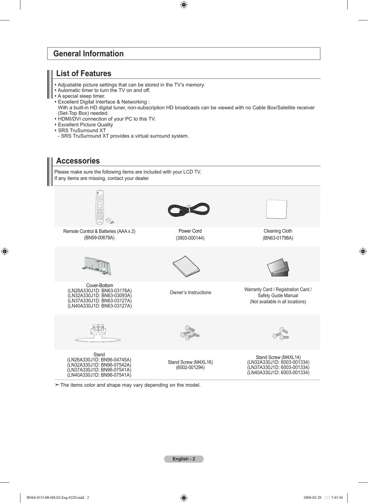 - Displaying still images from Video games and PC for longer than a certain period of time may produce partial after-images. To prevent this effect, reduce the ‘brightness’ and ‘contrast’ when displaying still images. © 2008 Samsung Electronics Co., Ltd. All rights reserved. BN68-01514B-00L02-Eng-0220.indd 1 2008-02-20 7:43:34 English Contents General Information
