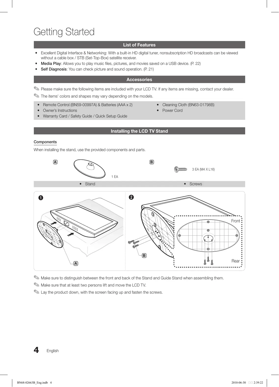 2010-06-30 2:39:21 Getting Started List of Features yy Excellent Digital Interface & Networking: With a built-in HD digital tuner, nonsubscription HD broadcasts can be viewed without a cable box / STB (Set-Top-Box) satellite receiver. yy Media Play: Allows you to play music files, pictures, and movies saved on a USB device. (P. 22) yy Self Diagnosis: You can check picture and sound operation. (P. 21) Accessories ✎✎Please make sure the following items are included with your LCD TV. If any items are missing, contact your dealer. ✎✎The items' colors and shapes may vary depending on the models. yy Remote Control (BN59-00997A) & Batteries (AAA x 2) yy Owner’s Instructions yy Warranty Card / Safety Guide / Quick Setup Guide yy Cleaning Cloth (BN63-01798B) yy Power Cord Installing the LCD TV Stand Components When installing the stand, use the provided components and parts.