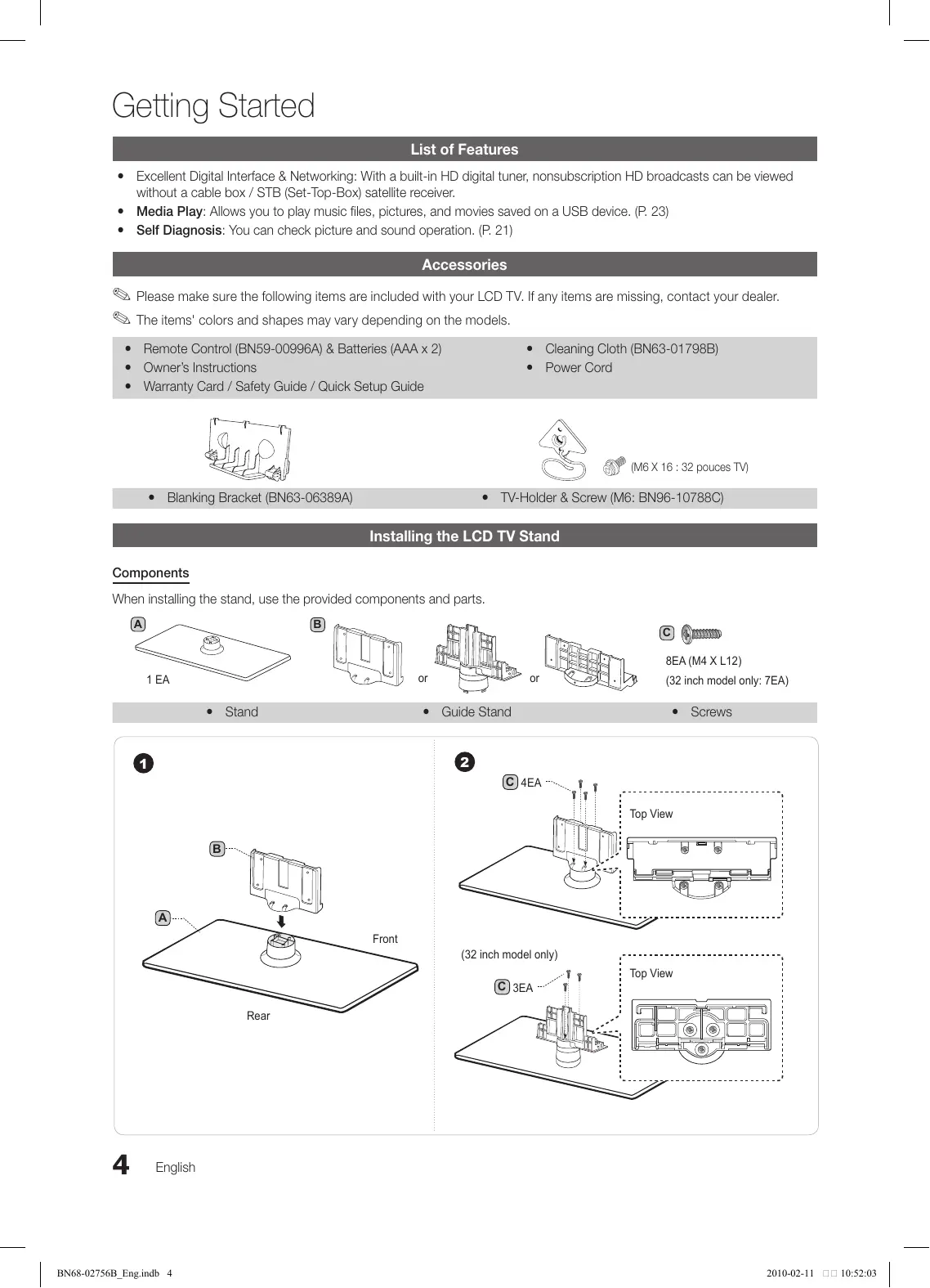 2010-02-11 10:51:59 Getting Started List of Features yy Excellent Digital Interface & Networking: With a built-in HD digital tuner, nonsubscription HD broadcasts can be viewed without a cable box / STB (Set-Top-Box) satellite receiver. yy Media Play: Allows you to play music files, pictures, and movies saved on a USB device. (P. 23) yy Self Diagnosis: You can check picture and sound operation. (P. 21) Accessories ✎✎Please make sure the following items are included with your LCD TV. If any items are missing, contact your dealer. ✎✎The items' colors and shapes may vary depending on the models. yy Remote Control (BN59-00996A) & Batteries (AAA x 2) yy Owner’s Instructions yy Warranty Card / Safety Guide / Quick Setup Guide yy Cleaning Cloth (BN63-01798B) yy Power Cord (M6 X 16 : 32 pouces TV) yy Blanking Bracket (BN63-06389A) yy TV-Holder & Screw (M6: BN96-10788C) Installing the LCD TV Stand Components When installing the stand, use the provided components and parts.