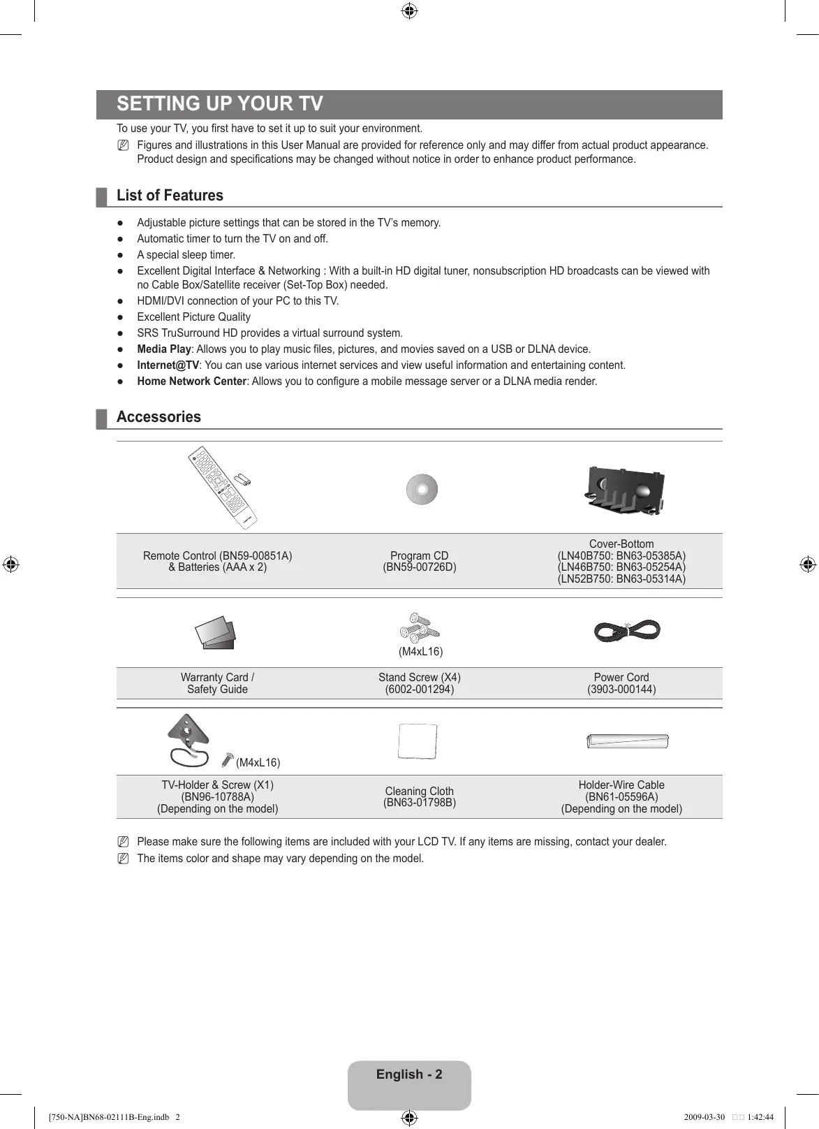 N Make sure to only use the supplied screws. cabinet 2. Firmly fasten the screws to the wall or cabinet where the TV is to be installed. Tie the TV-Holder attached to the TV and the screws fastened on the wall or cabinet so that the TV is fixed. N Purchase the screws to be used on the wall or cabinet separately. N Install the TV close to the wall so that it does not fall. N When attaching the TV to the wall, tie the cord level with the ground or slanted downwards for safety purposes. N Confirm that the cord or link does not come loose. N Before moving the TV, separate the connected cord first. cabinet cabinet . Verify all connections are properly secured. Periodically check connections for any sign of fatigue or failure. If you have any doubt about the security of your connections, contact a professional installer. ¦ Specifications Model Name LN40B750 Screen Size (Diagonal) 40 inches (40.0 inches measured diagonally) PC Resolution (Optimum) 1920 x 1080 @ 60 Hz Sound (Output) Dimensions (WxDxH) Body With stand Weight Without Stand With Stand Environmental Considerations Operating Temperature Operating Humidity Storage Temperature Storage Humidity Screen Size (Diagonal) 46 inches (46.0 inches measured diagonally) PC Resolution (Optimum) 1920 x 1080 @ 60 Hz Sound (Output) Dimensions (WxDxH) Body With stand Weight Without Stand With Stand Environmental Considerations Operating Temperature Operating Humidity Storage Temperature Storage Humidity Screen Size (Diagonal) 52 inches (52.0 inches measured diagonally) PC Resolution (Optimum) 1920 x 1080 @ 60 Hz Sound (Output) Dimensions (WxDxH) Body With stand Weight Without Stand With Stand Environmental Considerations Operating Temperature Operating Humidity Storage Temperature Storage Humidity N Design and specifications are subject to change without prior notice. N This device is a Class B digital apparatus. N For the power supply and Power Consumption, refer to the label attached to the product.