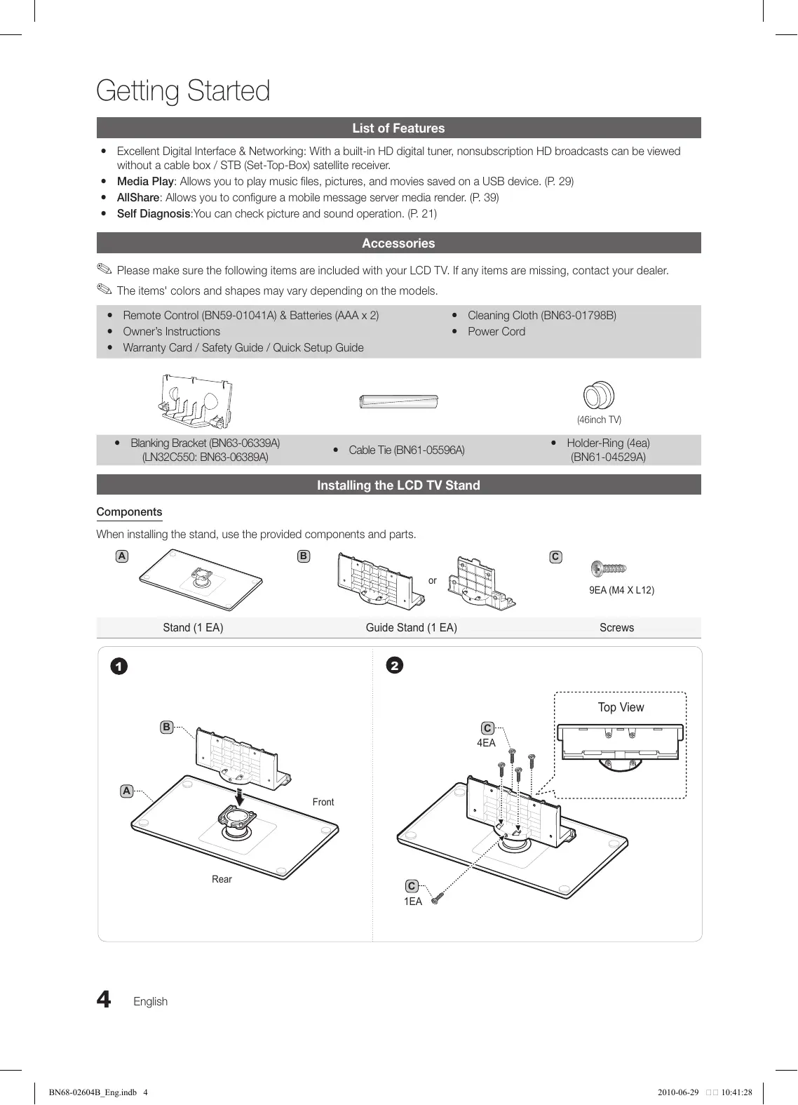 2010-06-29 10:41:27 Getting Started List of Features yy Excellent Digital Interface & Networking: With a built-in HD digital tuner, nonsubscription HD broadcasts can be viewed without a cable box / STB (Set-Top-Box) satellite receiver. yy Media Play: Allows you to play music files, pictures, and movies saved on a USB device. (P. 29) yy AllShare: Allows you to configure a mobile message server media render. (P. 39) yy Self Diagnosis:You can check picture and sound operation. (P. 21) Accessories ✎✎Please make sure the following items are included with your LCD TV. If any items are missing, contact your dealer. ✎✎The items' colors and shapes may vary depending on the models. yy Remote Control (BN59-01041A) & Batteries (AAA x 2) yy Owner’s Instructions yy Warranty Card / Safety Guide / Quick Setup Guide yy Cleaning Cloth (BN63-01798B) yy Power Cord (46inch TV) yy Blanking Bracket (BN63-06339A) (LN32C550: BN63-06389A) yy Holder-Ring (4ea) (BN61-04529A) yy Cable Tie (BN61-05596A) Installing the LCD TV Stand Components When installing the stand, use the provided components and parts.