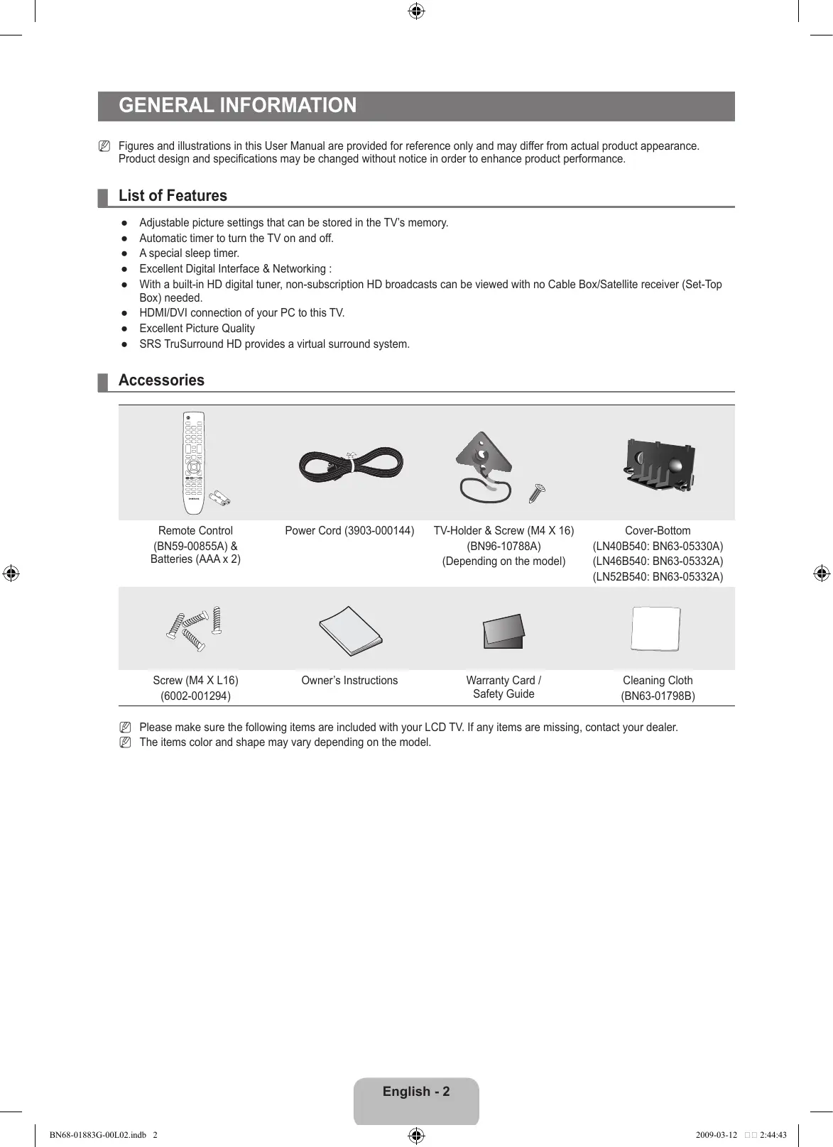 Adjustable picture settings that can be stored in the TV’s memory. Automatic timer to turn the TV on and off. A special sleep timer. Excellent Digital Interface & Networking : With a built-in HD digital tuner, non-subscription HD broadcasts can be viewed with no Cable Box/Satellite receiver (Set-Top Box) needed. ● HDMI/DVI connection of your PC to this TV. ● Excellent Picture Quality ● SRS TruSurround HD provides a virtual surround system. ¦ Accessories Remote Control (BN59-00855A) & Batteries (AAA x 2) Power Cord (3903-000144) TV-Holder & Screw (M4 X 16) (BN96-10788A) (Depending on the model) Cover-Bottom (LN40B540: BN63-05330A) (LN46B540: BN63-05332A) (LN52B540: BN63-05332A) Screw (M4 X L16) (6002-001294) Owner’s Instructions Warranty Card / Safety Guide Cleaning Cloth (BN63-01798B) N Please make sure the following items are included with your LCD TV. If any items are missing, contact your dealer. N The items color and shape may vary depending on the model. English - BN68-01883G-00L02.indb 2 2009-03-12 2:44:43 ¦ Viewing the Control Panel N The product color and shape may vary depending on the model. N You can use a button by pressing the side panel buttons.