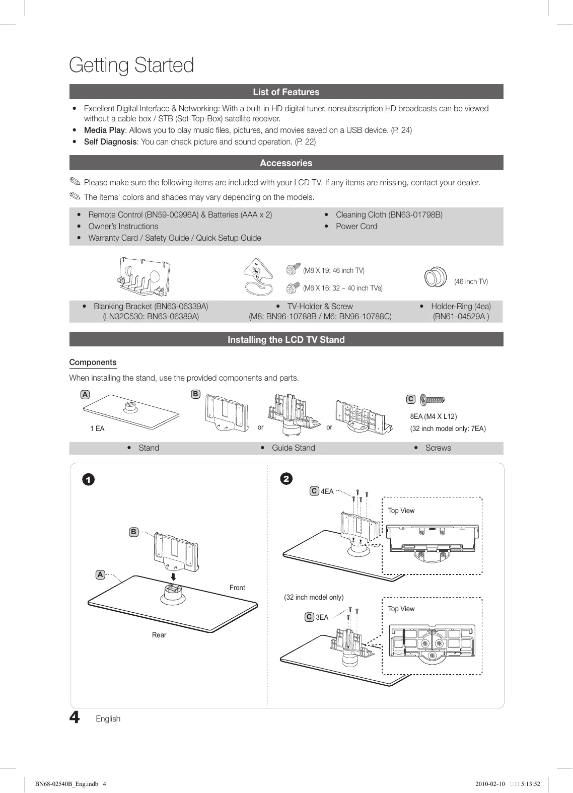 2010-02-10 5:13:49 Getting Started List of Features yy Excellent Digital Interface & Networking: With a built-in HD digital tuner, nonsubscription HD broadcasts can be viewed without a cable box / STB (Set-Top-Box) satellite receiver. yy Media Play: Allows you to play music files, pictures, and movies saved on a USB device. (P. 24) yy Self Diagnosis: You can check picture and sound operation. (P. 22) Accessories ✎✎Please make sure the following items are included with your LCD TV. If any items are missing, contact your dealer. ✎✎The items' colors and shapes may vary depending on the models. yy Remote Control (BN59-00996A) & Batteries (AAA x 2) yy Owner’s Instructions yy Warranty Card / Safety Guide / Quick Setup Guide yy Cleaning Cloth (BN63-01798B) yy Power Cord (M8 X 19: 46 inch TV) (46 inch TV) (M6 X 16: 32 ~ 40 inch TVs) yy Blanking Bracket (BN63-06339A) (LN32C530: BN63-06389A) yy TV-Holder & Screw (M8: BN96-10788B / M6: BN96-10788C) yy Holder-Ring (4ea) (BN61-04529A ) Installing the LCD TV Stand Components When installing the stand, use the provided components and parts.