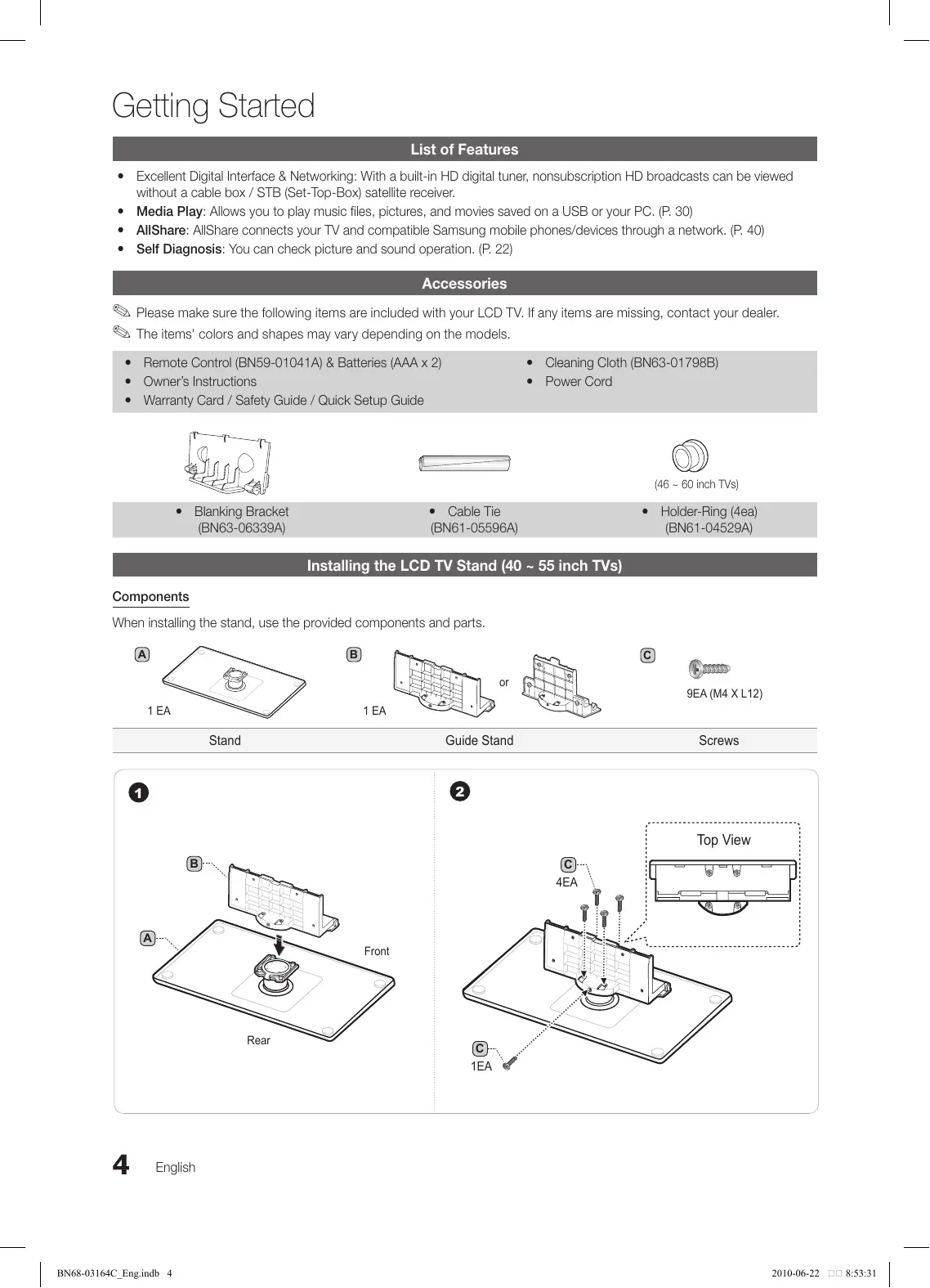 2010-06-22 8:53:30 Getting Started List of Features yy Excellent Digital Interface & Networking: With a built-in HD digital tuner, nonsubscription HD broadcasts can be viewed without a cable box / STB (Set-Top-Box) satellite receiver. yy Media Play: Allows you to play music files, pictures, and movies saved on a USB or your PC. (P. 30) yy AllShare: AllShare connects your TV and compatible Samsung mobile phones/devices through a network. (P. 40) yy Self Diagnosis: You can check picture and sound operation. (P. 22) Accessories ✎✎Please make sure the following items are included with your LCD TV. If any items are missing, contact your dealer. ✎✎The items' colors and shapes may vary depending on the models. yy Remote Control (BN59-01041A) & Batteries (AAA x 2) yy Owner’s Instructions yy Warranty Card / Safety Guide / Quick Setup Guide yy Cleaning Cloth (BN63-01798B) yy Power Cord (46 ~ 60 inch TVs) yy Blanking Bracket (BN63-06339A) yy Cable Tie (BN61-05596A) yy Holder-Ring (4ea) (BN61-04529A) Installing the LCD TV Stand (40 ~ 55 inch TVs) Components When installing the stand, use the provided components and parts.