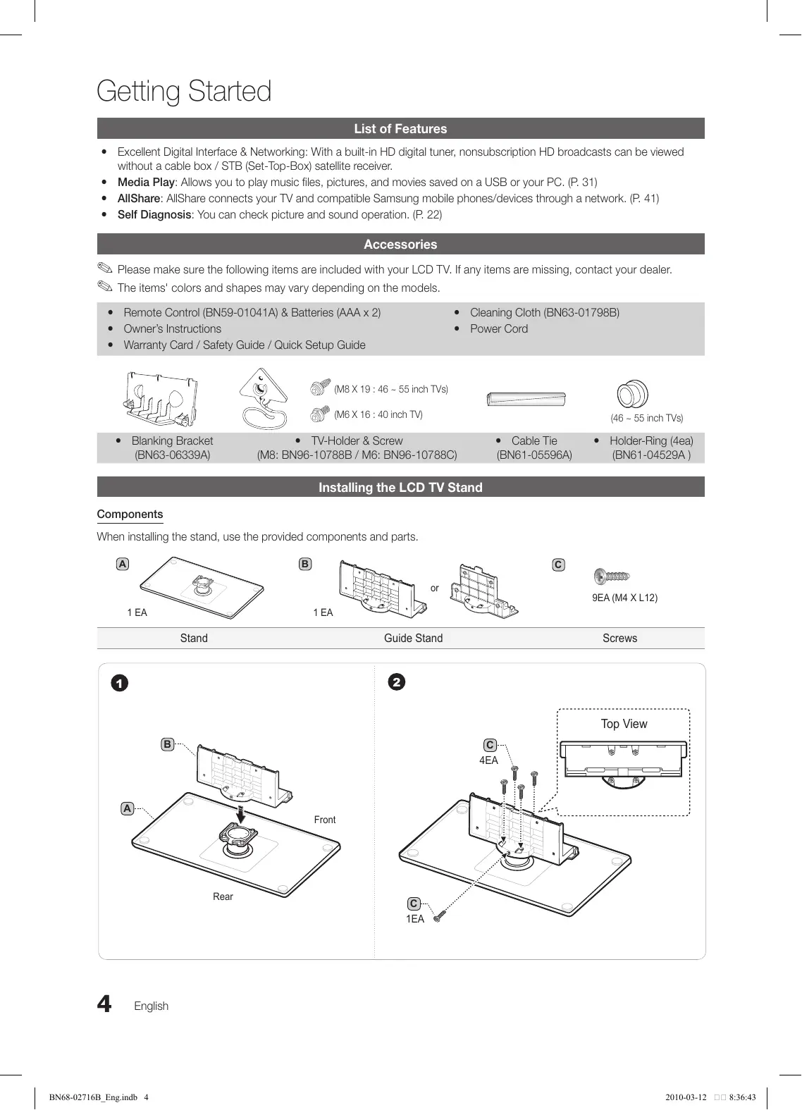 2010-03-12 8:36:41 Getting Started List of Features yy Excellent Digital Interface & Networking: With a built-in HD digital tuner, nonsubscription HD broadcasts can be viewed without a cable box / STB (Set-Top-Box) satellite receiver. yy Media Play: Allows you to play music files, pictures, and movies saved on a USB or your PC. (P. 31) yy AllShare: AllShare connects your TV and compatible Samsung mobile phones/devices through a network. (P. 41) yy Self Diagnosis: You can check picture and sound operation. (P. 22) Accessories ✎✎Please make sure the following items are included with your LCD TV. If any items are missing, contact your dealer. ✎✎The items' colors and shapes may vary depending on the models. yy Remote Control (BN59-01041A) & Batteries (AAA x 2) yy Owner’s Instructions yy Warranty Card / Safety Guide / Quick Setup Guide yy Cleaning Cloth (BN63-01798B) yy Power Cord (M8 X 19 : 46 ~ 55 inch TVs) (M6 X 16 : 40 inch TV) yy Blanking Bracket (BN63-06339A) (46 ~ 55 inch TVs) yy TV-Holder & Screw (M8: BN96-10788B / M6: BN96-10788C) yy Cable Tie (BN61-05596A) yy Holder-Ring (4ea) (BN61-04529A ) Installing the LCD TV Stand Components When installing the stand, use the provided components and parts.