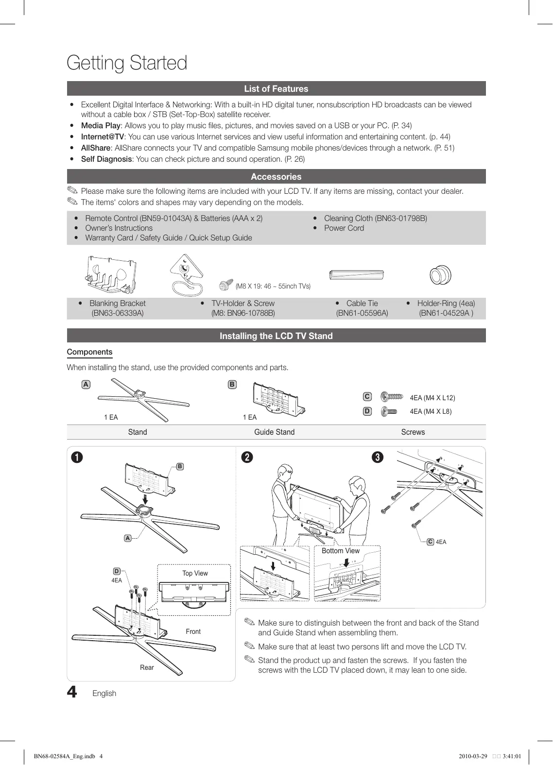 @ TV Getting Started List of Features yy Excellent Digital Interface & Networking: With a built-in HD digital tuner, nonsubscription HD broadcasts can be viewed without a cable box / STB (Set-Top-Box) satellite receiver. yy Media Play: Allows you to play music files, pictures, and movies saved on a USB or your PC. (P. 34) yy Internet@TV: You can use various Internet services and view useful information and entertaining content. (p. 44) yy AllShare: AllShare connects your TV and compatible Samsung mobile phones/devices through a network. (P. 51) yy Self Diagnosis: You can check picture and sound operation. (P. 26) Accessories ✎✎Please make sure the following items are included with your LCD TV. If any items are missing, contact your dealer. ✎✎The items' colors and shapes may vary depending on the models. yy Remote Control (BN59-01043A) & Batteries (AAA x 2) yy Owner’s Instructions yy Warranty Card / Safety Guide / Quick Setup Guide yy Cleaning Cloth (BN63-01798B) yy Power Cord yy Blanking Bracket (BN63-06339A) yy Cable Tie (BN61-05596A) yy Holder-Ring (4ea) (BN61-04529A ) Installing the LCD TV Stand Components When installing the stand, use the provided components and parts.