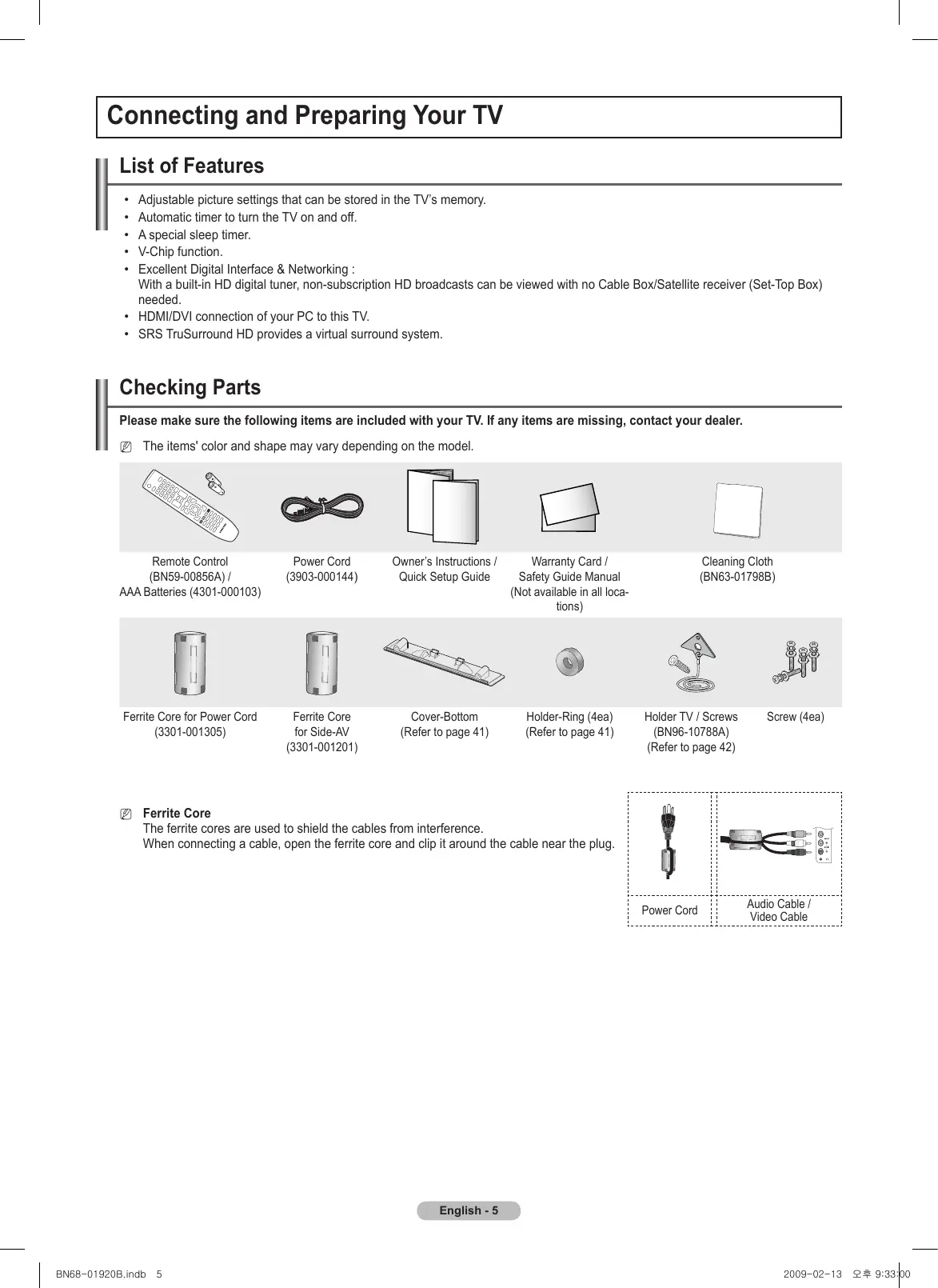 Note One-Touch Button TOOLS English - BN68-01920B.indb 4 2009-02-13 오후 9:32:58 Connecting and Preparing Your TV List of Features Adjustable picture settings that can be stored in the TV’s memory. Automatic timer to turn the TV on and off. A special sleep timer. V-Chip function. Excellent Digital Interface & Networking : With a built-in HD digital tuner, non-subscription HD broadcasts can be viewed with no Cable Box/Satellite receiver (Set-Top Box) needed.