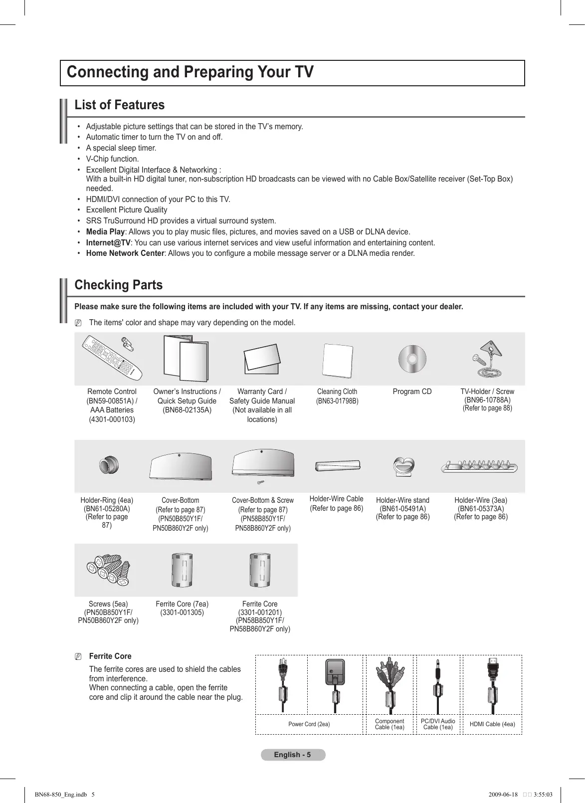 Adjustable picture settings that can be stored in the TV’s memory. Automatic timer to turn the TV on and off. A special sleep timer. V-Chip function. Excellent Digital Interface & Networking : With a built-in HD digital tuner, non-subscription HD broadcasts can be viewed with no Cable Box/Satellite receiver (Set-Top Box) needed. HDMI/DVI connection of your PC to this TV. Excellent Picture Quality SRS TruSurround HD provides a virtual surround system. Media Play: Allows you to play music files, pictures, and movies saved on a USB or DLNA device. Internet@TV: You can use various internet services and view useful information and entertaining content. Home Network Center: Allows you to configure a mobile message server or a DLNA media render. Checking Parts Please make sure the following items are included with your TV. If any items are missing, contact your dealer. NN The items' color and shape may vary depending on the model. Remote Control (BN59-00851A) / AAA Batteries (4301-000103) Owner’s Instructions / Quick Setup Guide (BN68-02135A) Holder-Ring (4ea) (BN61-05280A) (Refer to page 87) Cover-Bottom (Refer to page 87) (PN50B850Y1F/ PN50B860Y2F only) Screws (5ea) (PN50B850Y1F/ PN50B860Y2F only) Warranty Card / Safety Guide Manual (Not available in all locations) Cleaning Cloth (BN63-01798B) Cover-Bottom & Screw (Refer to page 87) (PN58B850Y1F/ PN58B860Y2F only) Holder-Wire Cable (Refer to page 86) Program CD Holder-Wire stand (BN61-05491A) (Refer to page 86) TV-Holder / Screw (BN96-10788A) (Refer to page 88) Holder-Wire (3ea) (BN61-05373A) (Refer to page 86) Ferrite Core (3301-001201) (PN58B850Y1F/ PN58B860Y2F only) The ferrite cores are used to shield the cables from interference. When connecting a cable, open the ferrite core and clip it around the cable near the plug. Power Cord (2ea) Component Cable (1ea) Viewing the Control Panel The buttons on the lower-right panel control your TV’s basic features, including the on-screen menu. To use the more advanced features, you must use the remote control. NN The product color and shape may vary depending on the model. NN The front panel buttons can be activated by touching them with your finger.