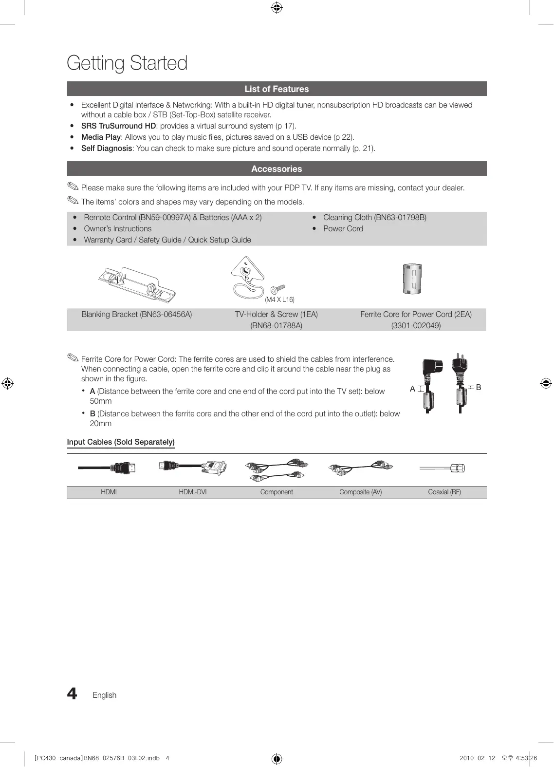 2010-02-12 오후 4:53:23 Getting Started List of Features yy Excellent Digital Interface & Networking: With a built-in HD digital tuner, nonsubscription HD broadcasts can be viewed without a cable box / STB (Set-Top-Box) satellite receiver. yy SRS TruSurround HD: provides a virtual surround system (p 17). yy Media Play: Allows you to play music files, pictures saved on a USB device (p 22). yy Self Diagnosis: You can check to make sure picture and sound operate normally (p. 21). Accessories ✎✎Please make sure the following items are included with your PDP TV. If any items are missing, contact your dealer. ✎✎The items’ colors and shapes may vary depending on the models. yy Remote Control (BN59-00997A) & Batteries (AAA x 2) yy Owner’s Instructions yy Warranty Card / Safety Guide / Quick Setup Guide yy Cleaning Cloth (BN63-01798B) yy Power Cord (M4 X L16) Blanking Bracket (BN63-06456A) TV-Holder & Screw (1EA) (BN68-01788A) Ferrite Core for Power Cord (2EA) (3301-002049) ✎✎Ferrite Core for Power Cord: The ferrite cores are used to shield the cables from interference. When connecting a cable, open the ferrite core and clip it around the cable near the plug as shown in the figure. xx A (Distance between the ferrite core and one end of the cord put into the TV set): below