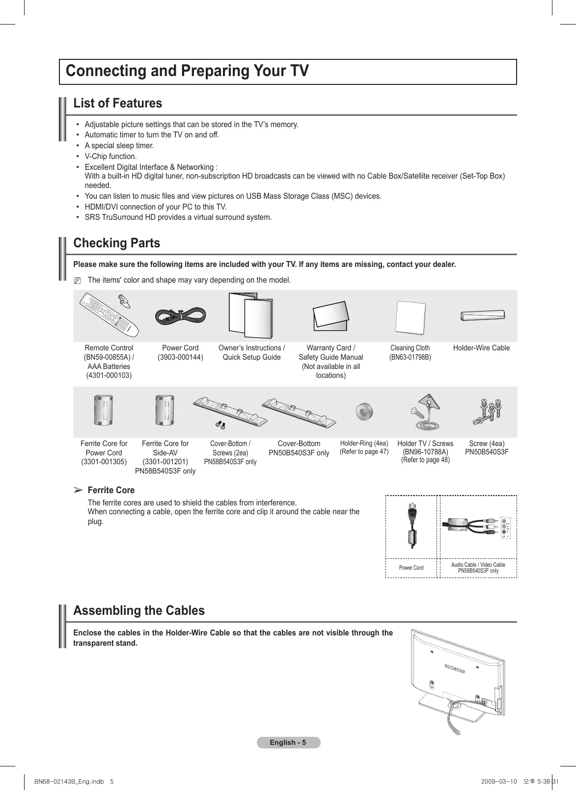 Note One-Touch Button TOOLS English - BN68-02143B_Eng.indb 4 2009-03-10 오후 5:38:30 Connecting and Preparing Your TV List of Features