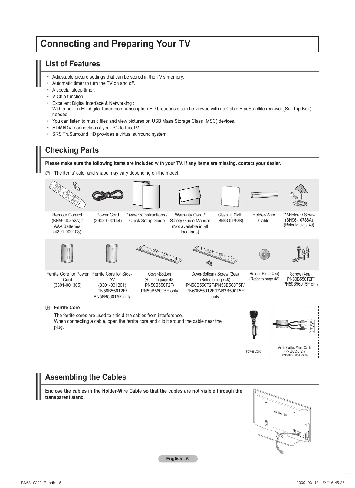 - SRS TruSurround HD provides a virtual surround system. Checking Parts Please make sure the following items are included with your TV. If any items are missing, contact your dealer. N The items' color and shape may vary depending on the model. Remote Control (BN59-00852A) / AAA Batteries (4301-000103) Power Cord (3903-000144) Owner’s Instructions / Warranty Card / Quick Setup Guide Safety Guide Manual (Not available in all locations) Ferrite Core for Power Ferrite Core for SideCord (3301-001305) (3301-001201) PN58B550T2F/ PN58B560T5F only Cover-Bottom (Refer to page 48) PN50B550T2F/ PN50B560T5F only Cleaning Cloth (BN63-01798B) Cover-Bottom / Screw (2ea) (Refer to page 48) PN58B550T2F/PN58B560T5F/ PN63B550T2F/PN63B590T5F only Holder-Wire Cable TV-Holder / Screw (BN96-10788A) (Refer to page 49) Holder-Ring (4ea) (Refer to page 48) Screw (4ea) PN50B550T2F/ PN50B560T5F only N Ferrite Core The ferrite cores are used to shield the cables from interference. When connecting a cable, open the ferrite core and clip it around the cable near the plug. Power Cord Audio Cable / Video Cable (PN58B550T2F/ PN58B560T5F only) Assembling the Cables Enclose the cables in the Holder-Wire Cable so that the cables are not visible through the transparent stand. English - BN68-02221B.indb 5 2009-03-13 오후 6:45:36 Viewing the Control Panel The buttons on the lower-right panel control your TV’s basic features, including the on-screen menu. To use the more advanced features, you must use the remote control. N The product color and shape may vary depending on the model. N If you touch the front panel button, the each button will be operated. PN50B550T2F/PN58B550T2F/PN63B550T2F 1 SOURCEE Toggles between all the available input sources (TV, AV1, AV2, Component1, Conponent2, PC, HDMI1, HDMI2/DVI, HDMI3, HDMI4). In the on-screen menu, use this button as you use the ENTERE button on the remote control. 2 MENU Press to see an on-screen menu of your TV’s features. 3 + VOL – Press to increase or decrease the volume. In the on-screen menu, use the + VOL – buttons as you would use the ◄ and ► buttons on the remote control. 4 < CH > Press to change channels. In the on-screen menu, use the < CH > buttons as you would use the ▲ and ▼ buttons on the remote control. 5 POWER INDICATOR Blinks and turns off when the power is on and lights up in stand-by mode. 6 P (POWER) Press to turn the TV on and off.