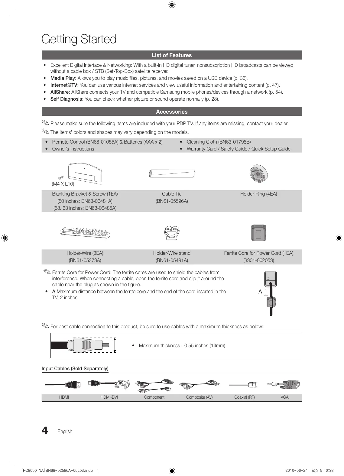 This function can be used by pressing the TOOLS button on the remote control. Note Step by Step Guide Indicates additional information. Check here for instructions on how to open the relevant submenu within the OSD (on screen display). English Getting Started List of Features yy Excellent Digital Interface & Networking: With a built-in HD digital tuner, nonsubscription HD broadcasts can be viewed without a cable box / STB (Set-Top-Box) satellite receiver. yy Media Play: Allows you to play music files, pictures, and movies saved on a USB device (p. 36). yy Internet@TV: You can use various internet services and view useful information and entertaining content (p. 47). yy AllShare: AllShare connects your TV and compatible Samsung mobile phones/devices through a network (p. 54). yy Self Diagnosis: You can check whether picture or sound operate normally (p. 28). Accessories ✎✎Please make sure the following items are included with your PDP TV. If any items are missing, contact your dealer. ✎✎The items' colors and shapes may vary depending on the models. yy Remote Control (BN68-01055A) & Batteries (AAA x 2) yy Owner’s Instructions yy Cleaning Cloth (BN63-01798B) yy Warranty Card / Safety Guide / Quick Setup Guide (M4 X L10) Blanking Bracket & Screw (1EA) (50 inches: BN63-06481A) (58, 63 inches: BN63-06485A) Cable Tie (BN61-05596A) Holder-Wire stand (BN61-05491A) Ferrite Core for Power Cord (1EA) (3301-002053) ✎✎Ferrite Core for Power Cord: The ferrite cores are used to shield the cables from interference. When connecting a cable, open the ferrite core and clip it around the cable near the plug as shown in the figure. yy A Maximum distance between the ferrite core and the end of the cord inserted in the TV: 2 inches