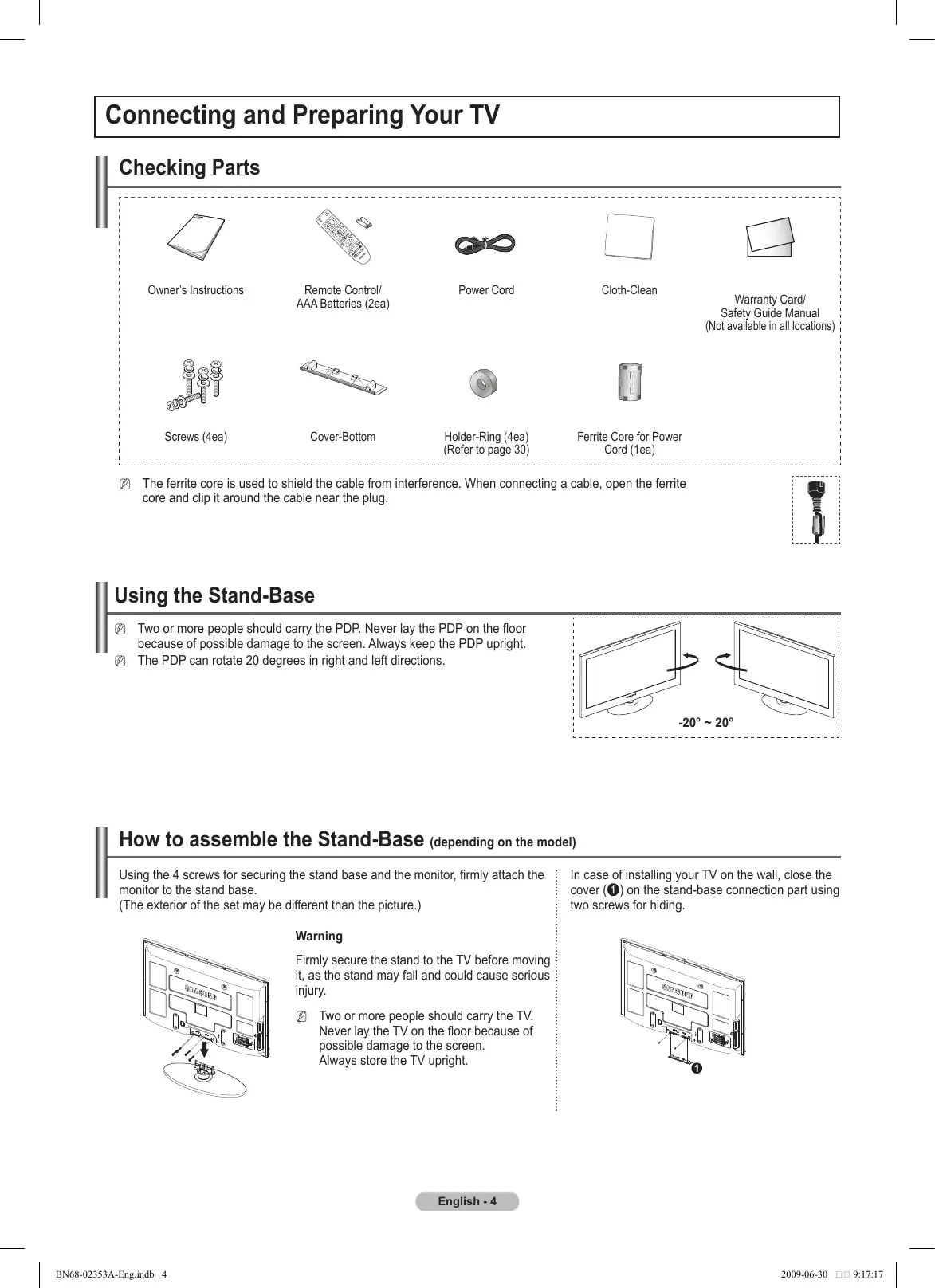 - Picture Control ■■ Changing the Picture Settings One-Touch Button TOOLS English - 3 BN68-02353A-Eng.indb 3 2009-06-30 9:17:14 Connecting and Preparing Your TV Checking Parts Owner’s Instructions Remote Control/ AAA Batteries (2ea) Power Cord Cloth-Clean Screws (4ea) Cover-Bottom Holder-Ring (4ea) (Refer to page 30) Ferrite Core for Power Cord (1ea) Warranty Card/ Safety Guide Manual (Not available in all locations) NN The ferrite core is used to shield the cable from interference. When connecting a cable, open the ferrite core and clip it around the cable near the plug. Using the Stand-Base NN Two or more people should carry the PDP. Never lay the PDP on the floor because of possible damage to the screen. Always keep the PDP upright. NN The PDP can rotate 20 degrees in right and left directions. -20° ~ 20° How to assemble the Stand-Base (depending on the model) Using the 4 screws for securing the stand base and the monitor, firmly attach the monitor to the stand base. (The exterior of the set may be different than the picture.) In case of installing your TV on the wall, close the cover (1) on the stand-base connection part using two screws for hiding. Warning Firmly secure the stand to the TV before moving it, as the stand may fall and could cause serious injury. NN Two or more people should carry the TV. Never lay the TV on the floor because of possible damage to the screen. Always store the TV upright. English - 4 BN68-02353A-Eng.indb 4 2009-06-30 9:17:17 Viewing the Control Panel Front Panel buttons NN The product colour and shape may vary depending on the model. 1 SOURCE Toggles between all the available input sources (TV, Ext., AV, Component, HDMI1, HDMI2/DVI). p. 17
