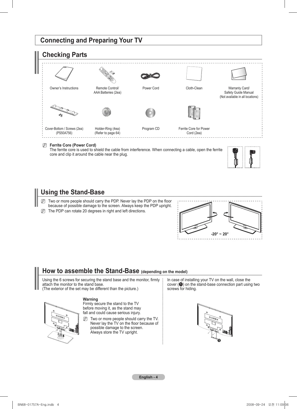 One-Touch Button TOOLS English - BN68-01757A-Eng.indb 3 2008-09-24 오전 11:09:04 Connecting and Preparing Your TV Checking Parts Owner’s Instructions Remote Control/ AAA Batteries (2ea) Power Cord Cloth-Clean Cover-Bottom / Screws (2ea) (PS50A756) Holder-Ring (4ea) (Refer to page 64) Program CD Ferrite Core for Power Cord (2ea) Warranty Card/ Safety Guide Manual (Not available in all locations) N Ferrite Core (Power Cord) The ferrite core is used to shield the cable from interference. When connecting a cable, open the ferrite core and clip it around the cable near the plug. Using the Stand-Base N Two or more people should carry the PDP. Never lay the PDP on the floor because of possible damage to the screen. Always keep the PDP upright. N The PDP can rotate 20 degrees in right and left directions. -20° ~ 20° How to assemble the Stand-Base (depending on the model) Using the 6 screws for securing the stand base and the monitor, firmly attach the monitor to the stand base. (The exterior of the set may be different than the picture.) In case of installing your TV on the wall, close the cover (1) on the stand-base connection part using two screws for hiding. Warning Firmly secure the stand to the TV before moving it, as the stand may fall and could cause serious injury. N Two or more people should carry the TV. Never lay the TV on the floor because of possible damage to the screen. Always store the TV upright. English - BN68-01757A-Eng.indb 4 2008-09-24 오전 11:09:06 Viewing the Control Panel N The product colour and shape may vary depending on the model. 1 SOURCE Toggles between all the available input sources (TV, Ext1, Ext2, AV, S-Video, Component, PC, HDMI1, HDMI2/DVI, HDMI3, HDMI4, USB, DLNA). Front Panel buttons Touch each button to operate. 7 SPEAKERS