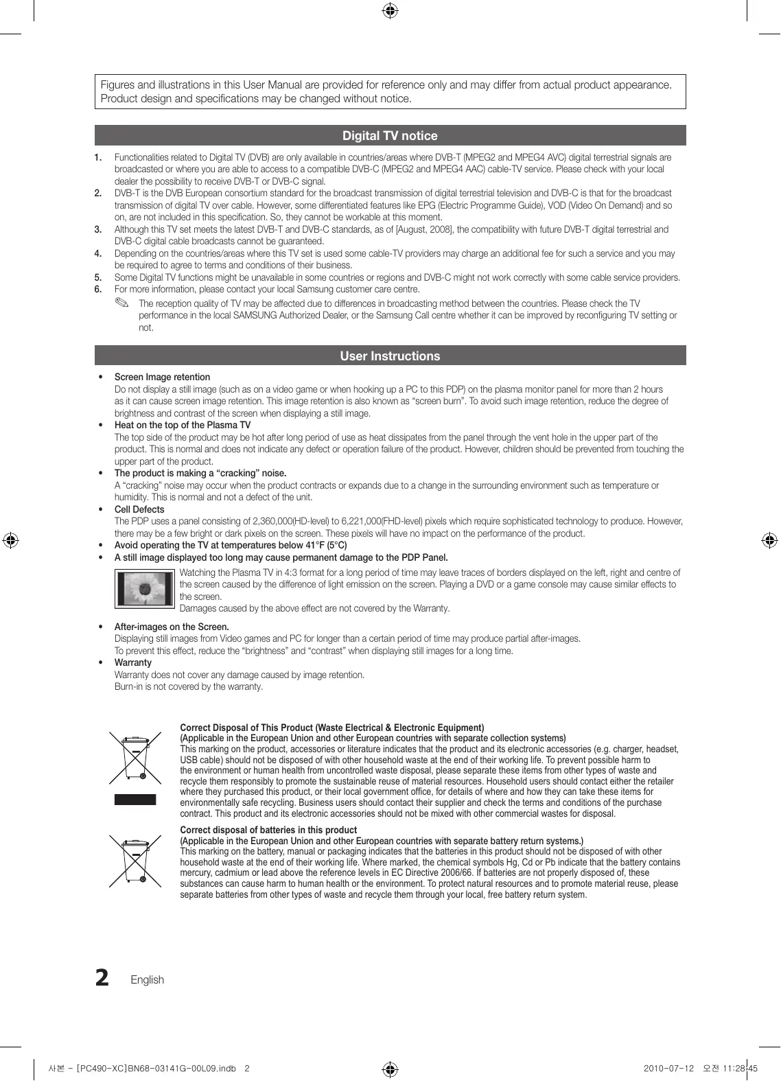 Plasma TV user manual Contact SAMSUNG WORLDWIDE If you have any questions or comments relating to Samsung products, please contact the SAMSUNG customer care centre. Plasma TV user manual imagine the possibilities Thank you for purchasing this Samsung product. To receive more complete service, please register your product at www.samsung.com/register Model______________ Serial No.______________ © 2010 Samsung Electronics Co., Ltd. All rights reserved. Figures and illustrations in this User Manual are provided for reference only and may differ from actual product appearance. Product design and specifications may be changed without notice. Functionalities related to Digital TV (DVB) are only available in countries/areas where DVB-T (MPEG2 and MPEG4 AVC) digital terrestrial signals are broadcasted or where you are able to access to a compatible DVB-C (MPEG2 and MPEG4 AAC) cable-TV service. Please check with your local dealer the possibility to receive DVB-T or DVB-C signal. DVB-T is the DVB European consortium standard for the broadcast transmission of digital terrestrial television and DVB-C is that for the broadcast transmission of digital TV over cable. However, some differentiated features like EPG (Electric Programme Guide), VOD (Video On Demand) and so on, are not included in this specification. So, they cannot be workable at this moment. Although this TV set meets the latest DVB-T and DVB-C standards, as of [August, 2008], the compatibility with future DVB-T digital terrestrial and DVB-C digital cable broadcasts cannot be guaranteed. Depending on the countries/areas where this TV set is used some cable-TV providers may charge an additional fee for such a service and you may be required to agree to terms and conditions of their business. Some Digital TV functions might be unavailable in some countries or regions and DVB-C might not work correctly with some cable service providers. For more information, please contact your local Samsung customer care centre. ✎✎ The reception quality of TV may be affected due to differences in broadcasting method between the countries. Please check the TV performance in the local SAMSUNG Authorized Dealer, or the Samsung Call centre whether it can be improved by reconfiguring TV setting or not. User Instructions