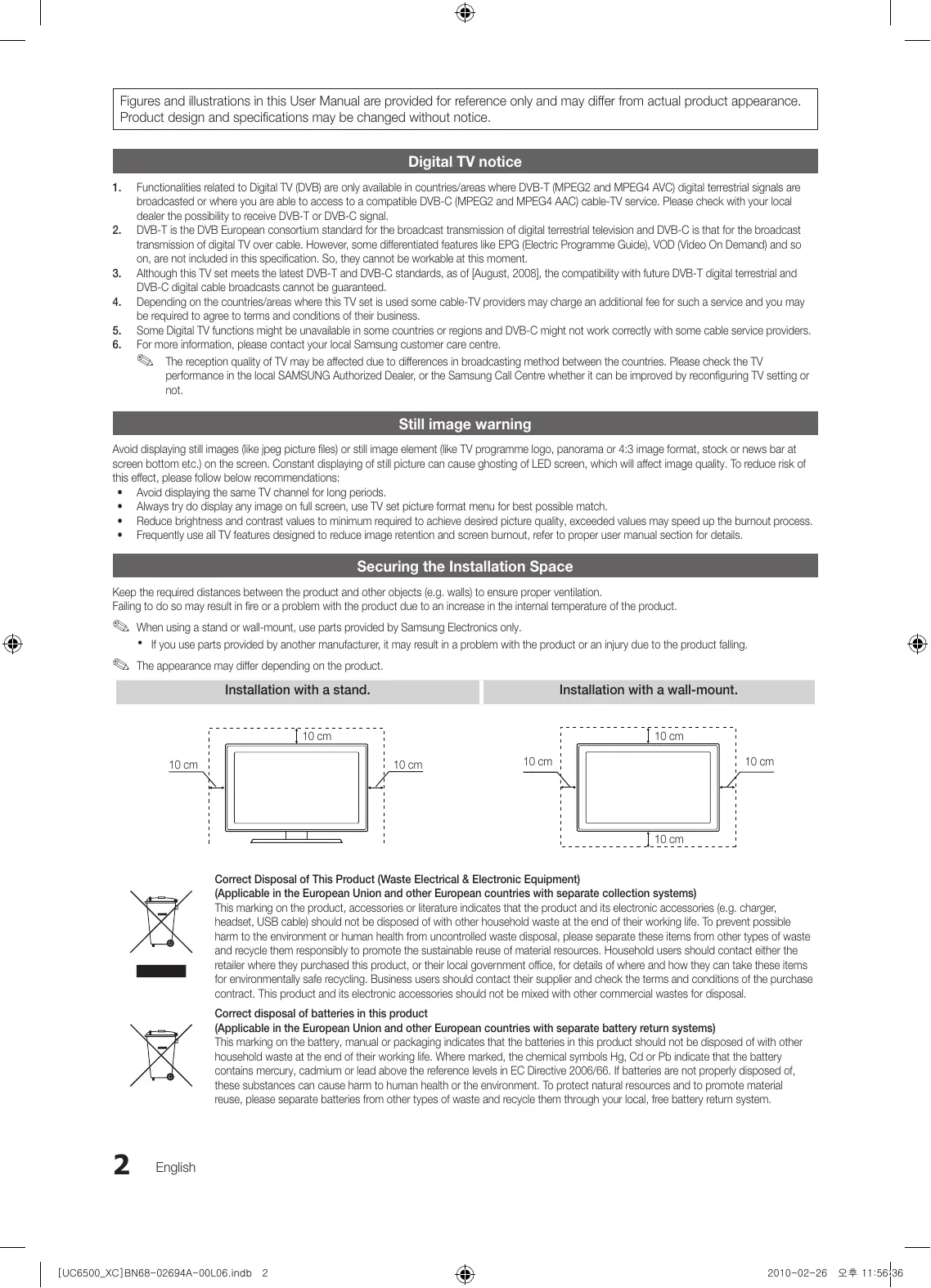 - Frequently use all TV features designed to reduce image retention and screen burnout, refer to proper user manual section for details. Securing the Installation Space Keep the required distances between the product and other objects (e.g. walls) to ensure proper ventilation. Failing to do so may result in fire or a problem with the product due to an increase in the internal temperature of the product. ✎✎ When using a stand or wall-mount, use parts provided by Samsung Electronics only. xx If you use parts provided by another manufacturer, it may result in a problem with the product or an injury due to the product falling. ✎✎ The appearance may differ depending on the product. Installation with a stand. Installation with a wall-mount. 10 cm 10 cm 10 cm 10 cm 10 cm 10 cm 10 cm Correct Disposal of This Product (Waste Electrical & Electronic Equipment) (Applicable in the European Union and other European countries with separate collection systems) This marking on the product, accessories or literature indicates that the product and its electronic accessories (e.g. charger, headset, USB cable) should not be disposed of with other household waste at the end of their working life. To prevent possible harm to the environment or human health from uncontrolled waste disposal, please separate these items from other types of waste and recycle them responsibly to promote the sustainable reuse of material resources. Household users should contact either the retailer where they purchased this product, or their local government office, for details of where and how they can take these items for environmentally safe recycling. Business users should contact their supplier and check the terms and conditions of the purchase contract. This product and its electronic accessories should not be mixed with other commercial wastes for disposal. Correct disposal of batteries in this product (Applicable in the European Union and other European countries with separate battery return systems) This marking on the battery, manual or packaging indicates that the batteries in this product should not be disposed of with other household waste at the end of their working life. Where marked, the chemical symbols Hg, Cd or Pb indicate that the battery contains mercury, cadmium or lead above the reference levels in EC Directive 2006/66. If batteries are not properly disposed of, these substances can cause harm to human health or the environment. To protect natural resources and to promote material reuse, please separate batteries from other types of waste and recycle them through your local, free battery return system.