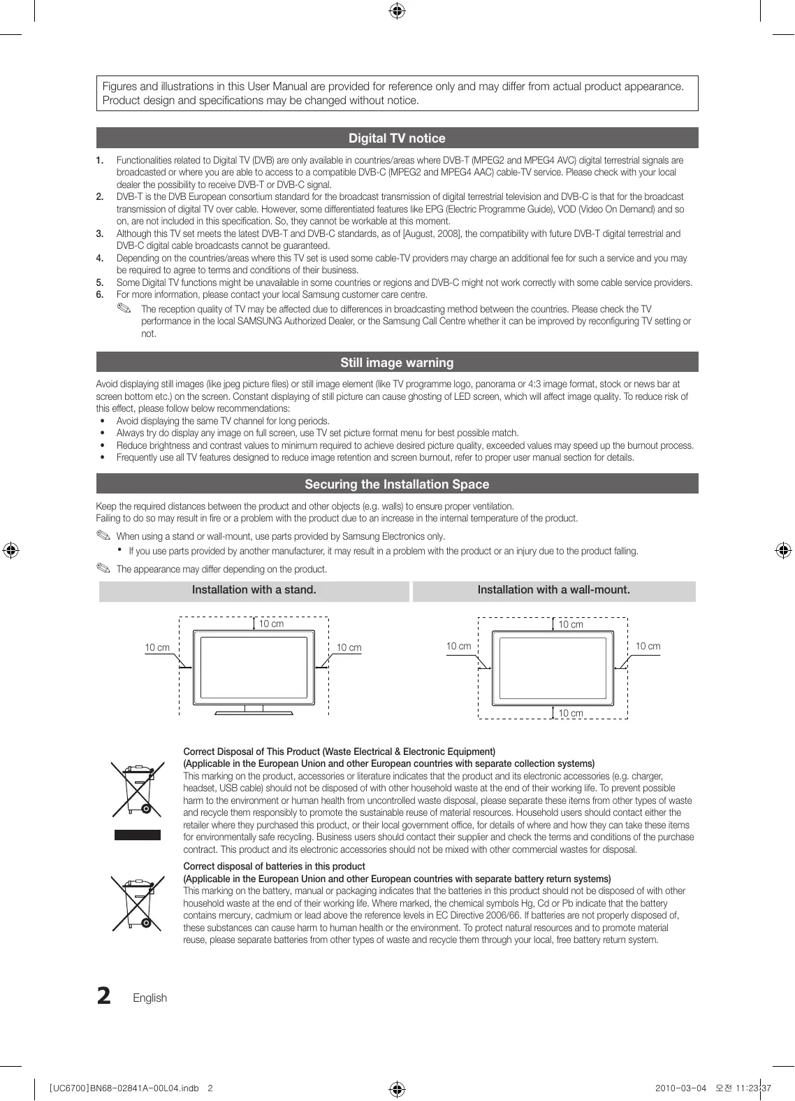 - Frequently use all TV features designed to reduce image retention and screen burnout, refer to proper user manual section for details. Securing the Installation Space Keep the required distances between the product and other objects (e.g. walls) to ensure proper ventilation. Failing to do so may result in fire or a problem with the product due to an increase in the internal temperature of the product. ✎✎ When using a stand or wall-mount, use parts provided by Samsung Electronics only. xx If you use parts provided by another manufacturer, it may result in a problem with the product or an injury due to the product falling. ✎✎ The appearance may differ depending on the product. Installation with a stand. Installation with a wall-mount. 10 cm 10 cm 10 cm 10 cm 10 cm 10 cm 10 cm Correct Disposal of This Product (Waste Electrical & Electronic Equipment) (Applicable in the European Union and other European countries with separate collection systems) This marking on the product, accessories or literature indicates that the product and its electronic accessories (e.g. charger, headset, USB cable) should not be disposed of with other household waste at the end of their working life. To prevent possible harm to the environment or human health from uncontrolled waste disposal, please separate these items from other types of waste and recycle them responsibly to promote the sustainable reuse of material resources. Household users should contact either the retailer where they purchased this product, or their local government office, for details of where and how they can take these items for environmentally safe recycling. Business users should contact their supplier and check the terms and conditions of the purchase contract. This product and its electronic accessories should not be mixed with other commercial wastes for disposal. Correct disposal of batteries in this product (Applicable in the European Union and other European countries with separate battery return systems) This marking on the battery, manual or packaging indicates that the batteries in this product should not be disposed of with other household waste at the end of their working life. Where marked, the chemical symbols Hg, Cd or Pb indicate that the battery contains mercury, cadmium or lead above the reference levels in EC Directive 2006/66. If batteries are not properly disposed of, these substances can cause harm to human health or the environment. To protect natural resources and to promote material reuse, please separate batteries from other types of waste and recycle them through your local, free battery return system.