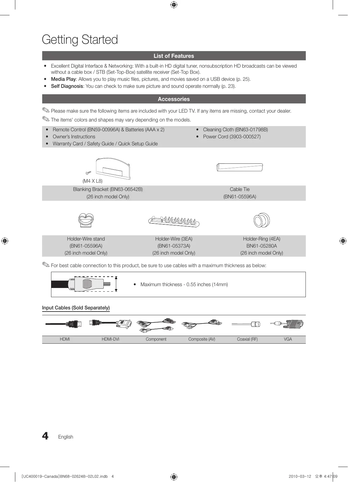 2010-03-12 오후 4:47:07 Getting Started List of Features yy Excellent Digital Interface & Networking: With a built-in HD digital tuner, nonsubscription HD broadcasts can be viewed without a cable box / STB (Set-Top-Box) satellite receiver (Set-Top Box). yy Media Play: Allows you to play music files, pictures, and movies saved on a USB device (p. 25). yy Self Diagnosis: You can check to make sure picture and sound operate normally (p. 23). Accessories ✎✎Please make sure the following items are included with your LED TV. If any items are missing, contact your dealer. ✎✎The items' colors and shapes may vary depending on the models. yy Remote Control (BN59-00996A) & Batteries (AAA x 2) yy Owner’s Instructions yy Warranty Card / Safety Guide / Quick Setup Guide yy Cleaning Cloth (BN63-01798B) yy Power Cord (3903-000527) (M4 X L8) Blanking Bracket (BN63-06542B) (26 inch model Only) Holder-Wire stand (BN61-05596A) (26 inch model Only) Cable Tie (BN61-05596A) Holder-Wire (3EA) (BN61-05373A) (26 inch model Only) Holder-Ring (4EA) BN61-05280A (26 inch model Only) ✎✎For best cable connection to this product, be sure to use cables with a maximum thickness as below: yy Maximum thickness - 0.55 inches (14mm) Input Cables (Sold Separately) HDMI