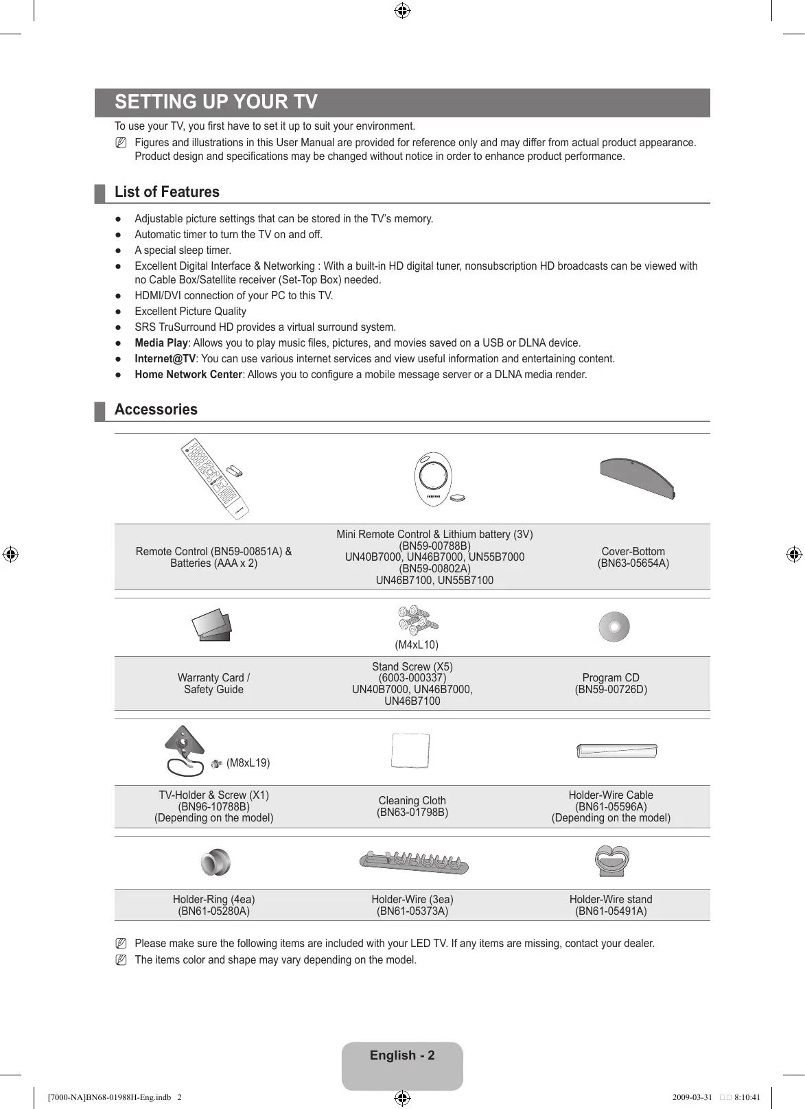 - Customer Care Center Web Site CANADA 1-800-SAMSUNG(726-7864) www.samsung.com/ca U.S.A 1-800-SAMSUNG(726-7864) www.samsung.com/us Address Samsung Electronics Canada Inc., Customer Service 55 Standish Court Mississauga, Ontario L5R 4B2 Canada Samsung Electronique Canada Inc., Service à la Clientèle 55 Standish Court Mississauga, Ontario L5R 4B2 Canada Samsung Electronics America, Inc. 105 Challenger Road Ridgefield Park, NJ 07660-0511 LED TV user manual imagine the possibilities Thank you for purchasing this Samsung product. To receive more complete service, please register your product at www.samsung.com/register Model Serial No. BN68-01988H-00 ❑ Important Warranty Information Regarding Television Format Viewing N See the warranty card for more information on warranty terms. Wide screen format LED Displays (16:9, the aspect ratio of the screen width to height) are primarily designed to view wide screen format full-motion video. The images displayed on them should primarily be in the wide screen 16:9 ratio format, or expanded to fill the screen if your model offers this feature and the images are constantly moving. Displaying stationary graphics and images on screen, such as the dark sidebars on nonexpanded standard format television video and programming, should be limited to no more than 5% of the total television viewing per week. Additionally, viewing other stationary images and text such as stock market reports, video game displays, station logos, web sites or computer graphics and patterns, should be limited as described above for all televisions. Displaying stationary images that exceed the above guidelines can cause uneven aging of LED Displays that leave subtle, but permanent burned-in ghost images in the LED picture. To avoid this, vary the programming and images, and primarily display full screen moving images, not stationary patterns or dark bars. On LED models that offer picture sizing features, use these controls to view different formats as a full screen picture. Be careful in the selection and duration of television formats used for viewing. Uneven LED aging as a result of format selection and use, as well as burned-in images, are not covered by your Samsung limited warranty. ● U.S.A Only The product unit accompanying this user manual is licensed under certain intellectual property rights of certain third parties. In particular, this product is licensed under the following US patents: 5,991,715, 5,740,317, 4,972,484, 5,214,678, 5,323,396, 5,539,829, 5,606,618, 5,530,655, 5,777,992, 6,289,308, 5,610,985, 5,481,643, 5,544,247, 5,960,037, 6,023,490, 5,878,080, and under US Published Patent Application No. 2001-44713-A1. This license is limited to private non-commercial use by end-user consumers for licensed contents. No rights are granted for commercial use. The license does not cover any product unit other than this product unit and the license does not extend to any unlicensed product unit or process conforming to ISO/IEC 11172-3 or ISO/IEC 13818-3 used or sold in combination with this product unit. The license only covers the use of this product unit to encode and/or decode audio files conforming to the ISO/IEC 11172-3 or ISO/IEC 13818-3. No rights are granted under this license for product features or functions that do not conform to the ISO/IEC 11172-3 or ISO/IEC 13818-3. ● Other countries The product unit accompanying this user manual is licensed under certain intellectual property rights of certain third parties. This license is limited to private non-commercial use by end-user consumers for licensed contents. No rights are granted for commercial use. The license does not cover any product unit other than this product unit and the license does not extend to any unlicensed product unit or process conforming to ISO/IEC 11172-3 or ISO/IEC 13818-3 used or sold in combination with this product unit. The license only covers the use of this product unit to encode and/or decode audio files conforming to the ISO/IEC 11172-3 or ISO/IEC 13818-3. No rights are granted under this license for product features or functions that do not conform to the ISO/IEC 11172-3 or ISO/IEC 13818-3. ● SAMSUNG ELECTRONICS NORTH AMERICAN LIMITED WARRANTY STATEMENT Subject to the requirements, conditions, exclusions and limitations of the original Limited Warranty supplied with Samsung Electronics (SAMSUNG) products, and the requirements, conditions, exclusions and limitations contained herein, SAMSUNG will additionally provide Warranty Repair Service in the United States on SAMSUNG products purchased in Canada, and in Canada on SAMSUNG products purchased in the United States, for the warranty period originally specified, and to the Original Purchaser only. The above described warranty repairs must be performed by a SAMSUNG Authorized Service Center. Along with this Statement, the Original Limited Warranty Statement and a dated Bill of Sale as Proof of Purchase must be presented to the Service Center. Transportation to and from the Service Center is the responsibility of the purchaser. Conditions covered are limited only to manufacturing defects in material or workmanship, and only those encountered in normal use of the product. Excluded, but not limited to, are any originally specified provisions for, in-home or on-site services, minimum or maximum repair times, exchanges or replacements, accessories, options, upgrades, or consumables. For the location of a SAMSUNG Authorized Service Center, please call toll-free: N In the United States : 1-800-SAMSUNG (1-800-726-7864) N In Canada : 1-800-SAMSUNG ❑ Precautions When Displaying a Still Image A still image may cause permanent damage to the TV screen ● Do not display a still image on the LED panel for more than 2 hours as it can cause screen image retention. This image retention is also known as screen burn. To avoid such image retention, reduce the degree of brightness and contrast of the screen when displaying a still image. Watching the