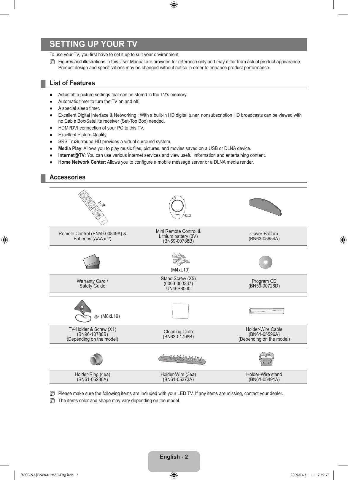 - Customer Care Center Web Site CANADA 1-800-SAMSUNG(726-7864) www.samsung.com/ca U.S.A 1-800-SAMSUNG(726-7864) www.samsung.com/us Address Samsung Electronics Canada Inc., Customer Service 55 Standish Court Mississauga, Ontario L5R 4B2 Canada Samsung Electronique Canada Inc., Service à la Clientèle 55 Standish Court Mississauga, Ontario L5R 4B2 Canada Samsung Electronics America, Inc. 105 Challenger Road Ridgefield Park, NJ 07660-0511 LED TV user manual imagine the possibilities Thank you for purchasing this Samsung product. To receive more complete service, please register your product at www.samsung.com/register Model Serial No. BN68-01988E-00 ❑ Important Warranty Information Regarding Television Format Viewing N See the warranty card for more information on warranty terms. Wide screen format LED Displays (16:9, the aspect ratio of the screen width to height) are primarily designed to view wide screen format full-motion video. The images displayed on them should primarily be in the wide screen 16:9 ratio format, or expanded to fill the screen if your model offers this feature and the images are constantly moving. Displaying stationary graphics and images on screen, such as the dark sidebars on nonexpanded standard format television video and programming, should be limited to no more than 5% of the total television viewing per week. Additionally, viewing other stationary images and text such as stock market reports, video game displays, station logos, web sites or computer graphics and patterns, should be limited as described above for all televisions. Displaying stationary images that exceed the above guidelines can cause uneven aging of LED Displays that leave subtle, but permanent burned-in ghost images in the LED picture. To avoid this, vary the programming and images, and primarily display full screen moving images, not stationary patterns or dark bars. On LED models that offer picture sizing features, use these controls to view different formats as a full screen picture. Be careful in the selection and duration of television formats used for viewing. Uneven LED aging as a result of format selection and use, as well as burned-in images, are not covered by your Samsung limited warranty. ● U.S.A Only The product unit accompanying this user manual is licensed under certain intellectual property rights of certain third parties. In particular, this product is licensed under the following US patents: 5,991,715, 5,740,317, 4,972,484, 5,214,678, 5,323,396, 5,539,829, 5,606,618, 5,530,655, 5,777,992, 6,289,308, 5,610,985, 5,481,643, 5,544,247, 5,960,037, 6,023,490, 5,878,080, and under US Published Patent Application No. 2001-44713-A1. This license is limited to private non-commercial use by end-user consumers for licensed contents. No rights are granted for commercial use. The license does not cover any product unit other than this product unit and the license does not extend to any unlicensed product unit or process conforming to ISO/IEC 11172-3 or ISO/IEC 13818-3 used or sold in combination with this product unit. The license only covers the use of this product unit to encode and/or decode audio files conforming to the ISO/IEC 11172-3 or ISO/IEC 13818-3. No rights are granted under this license for product features or functions that do not conform to the ISO/IEC 11172-3 or ISO/IEC 13818-3. ● Other countries The product unit accompanying this user manual is licensed under certain intellectual property rights of certain third parties. This license is limited to private non-commercial use by end-user consumers for licensed contents. No rights are granted for commercial use. The license does not cover any product unit other than this product unit and the license does not extend to any unlicensed product unit or process conforming to ISO/IEC 11172-3 or ISO/IEC 13818-3 used or sold in combination with this product unit. The license only covers the use of this product unit to encode and/or decode audio files conforming to the ISO/IEC 11172-3 or ISO/IEC 13818-3. No rights are granted under this license for product features or functions that do not conform to the ISO/IEC 11172-3 or ISO/IEC 13818-3. ● SAMSUNG ELECTRONICS NORTH AMERICAN LIMITED WARRANTY STATEMENT Subject to the requirements, conditions, exclusions and limitations of the original Limited Warranty supplied with Samsung Electronics (SAMSUNG) products, and the requirements, conditions, exclusions and limitations contained herein, SAMSUNG will additionally provide Warranty Repair Service in the United States on SAMSUNG products purchased in Canada, and in Canada on SAMSUNG products purchased in the United States, for the warranty period originally specified, and to the Original Purchaser only. The above described warranty repairs must be performed by a SAMSUNG Authorized Service Center. Along with this Statement, the Original Limited Warranty Statement and a dated Bill of Sale as Proof of Purchase must be presented to the Service Center. Transportation to and from the Service Center is the responsibility of the purchaser. Conditions covered are limited only to manufacturing defects in material or workmanship, and only those encountered in normal use of the product. Excluded, but not limited to, are any originally specified provisions for, in-home or on-site services, minimum or maximum repair times, exchanges or replacements, accessories, options, upgrades, or consumables. For the location of a SAMSUNG Authorized Service Center, please call toll-free: N In the United States : 1-800-SAMSUNG (1-800-726-7864) N In Canada : 1-800-SAMSUNG ❑ Precautions When Displaying a Still Image A still image may cause permanent damage to the TV screen ● Do not display a still image on the LED panel for more than 2 hours as it can cause screen image retention. This image retention is also known as screen burn. To avoid such image retention, reduce the degree of brightness and contrast of the screen when displaying a still image. Watching the