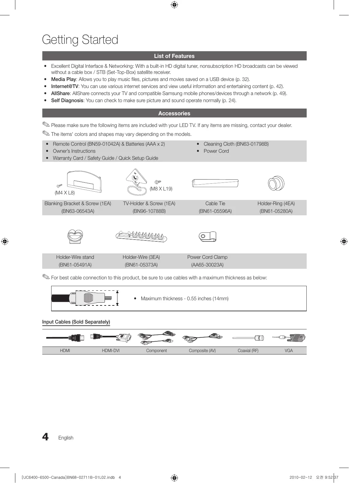 2010-02-12 오전 10:00:58 Getting Started List of Features yy Excellent Digital Interface & Networking: With a built-in HD digital tuner, nonsubscription HD broadcasts can be viewed without a cable box / STB (Set-Top-Box) satellite receiver. yy Media Play: Allows you to play music files, pictures and movies saved on a USB device (p. 32). yy Internet@TV: You can use various internet services and view useful information and entertaining content (p. 42). yy AllShare: AllShare connects your TV and compatible Samsung mobile phones/devices through a network (p. 49). yy Self Diagnosis: You can check to make sure picture and sound operate normally (p. 24). Accessories ✎✎Please make sure the following items are included with your LED TV. If any items are missing, contact your dealer. ✎✎The items' colors and shapes may vary depending on the models. yy Remote Control (BN59-01042A) & Batteries (AAA x 2) yy Owner’s Instructions yy Warranty Card / Safety Guide / Quick Setup Guide yy Cleaning Cloth (BN63-01798B) yy Power Cord (M8 X L19) (M4 X L8) Blanking Bracket & Screw (1EA) (BN63-06543A) Holder-Wire stand (BN61-05491A) TV-Holder & Screw (1EA) (BN96-10788B) Holder-Wire (3EA) (BN61-05373A) Cable Tie (BN61-05596A) Holder-Ring (4EA) (BN61-05280A) Power Cord Clamp (AA65-30023A) ✎✎For best cable connection to this product, be sure to use cables with a maximum thickness as below: yy Maximum thickness - 0.55 inches (14mm) Input Cables (Sold Separately) HDMI