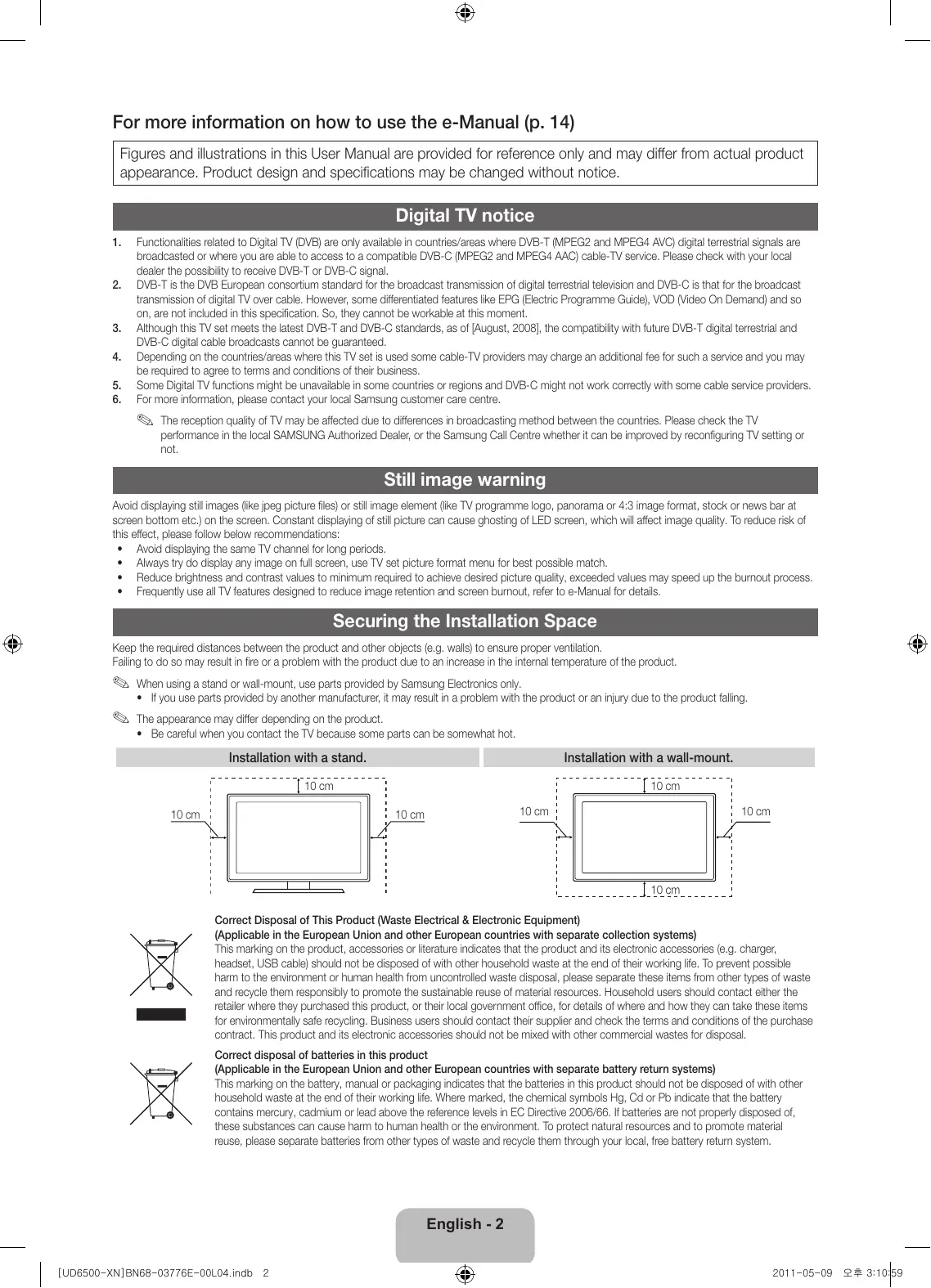 - Be careful when you contact the TV because some parts can be somewhat hot. Installation with a stand. Installation with a wall-mount. 10 cm 10 cm 10 cm 10 cm 10 cm 10 cm 10 cm Correct Disposal of This Product (Waste Electrical & Electronic Equipment) (Applicable in the European Union and other European countries with separate collection systems) This marking on the product, accessories or literature indicates that the product and its electronic accessories (e.g. charger, headset, USB cable) should not be disposed of with other household waste at the end of their working life. To prevent possible harm to the environment or human health from uncontrolled waste disposal, please separate these items from other types of waste and recycle them responsibly to promote the sustainable reuse of material resources. Household users should contact either the retailer where they purchased this product, or their local government office, for details of where and how they can take these items for environmentally safe recycling. Business users should contact their supplier and check the terms and conditions of the purchase contract. This product and its electronic accessories should not be mixed with other commercial wastes for disposal. Correct disposal of batteries in this product (Applicable in the European Union and other European countries with separate battery return systems) This marking on the battery, manual or packaging indicates that the batteries in this product should not be disposed of with other household waste at the end of their working life. Where marked, the chemical symbols Hg, Cd or Pb indicate that the battery contains mercury, cadmium or lead above the reference levels in EC Directive 2006/66. If batteries are not properly disposed of, these substances can cause harm to human health or the environment. To protect natural resources and to promote material reuse, please separate batteries from other types of waste and recycle them through your local, free battery return system. English - 2 [UD6500-XN]BN68-03776E-00L04.indb 2 2011-05-09 오후 3:10:59 Accessories ✎✎Please make sure the following items are included with your TV. If any items are missing, contact your dealer. ✎✎The items’ colours and shapes may vary depending on the models. ✎✎Cables not included in the package contents can be purchased separately. ✎✎Check that there is no accessory hidden behind packing materials when you open the box. [[CAUTION: INSERT SECURELY LEST SHOULD BE DETACHED IN SET