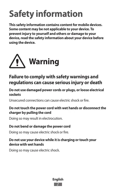 Safety information This safety information contains content for mobile devices. Some content may be not applicable to your device. To prevent injury to yourself and others or damage to your device, read the safety information about your device before using the device. Warning Failure to comply with safety warnings and regulations can cause serious injury or death Do not use damaged power cords or plugs, or loose electrical sockets Unsecured connections can cause electric shock or fire. Do not touch the power cord with wet hands or disconnect the charger by pulling the cord Doing so may result in electrocution. Do not bend or damage the power cord Doing so may cause electric shock or fire. Do not use your device while it is charging or touch your device with wet hands Doing so may cause electric shock. English