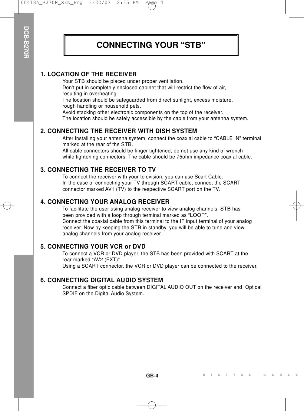 Download the instructions for your TV Decoder in PDF format for free! Find your manual DCB-B270 - SAMSUNG and take your electronic device back in hand. On this page are published all the documents necessary for the use of your device. DCB-B270 by SAMSUNG.