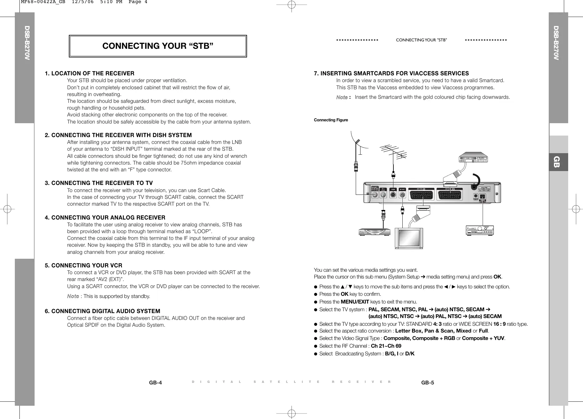 Your STB should be placed under proper ventilation. Don’t put in completely enclosed cabinet that will restrict the flow of air, resulting in overheating. The location should be safeguarded from direct sunlight, excess moisture, rough handling or household pets. Avoid stacking other electronic components on the top of the receiver. The location should be safely accessible by the cable from your antenna system. In order to view a scrambled service, you need to have a valid Smartcard. This STB has the Viaccess embedded to view Viaccess programmes. Note : Insert the Smartcard with the gold coloured chip facing downwards. Connecting Figure After installing your antenna system, connect the coaxial cable from the LNB of your antenna to “DISH INPUT” terminal marked at the rear of the STB. All cable connectors should be finger tightened; do not use any kind of wrench while tightening connectors. The cable should be 75ohm impedance coaxial twisted at the end with an “F” type connector.