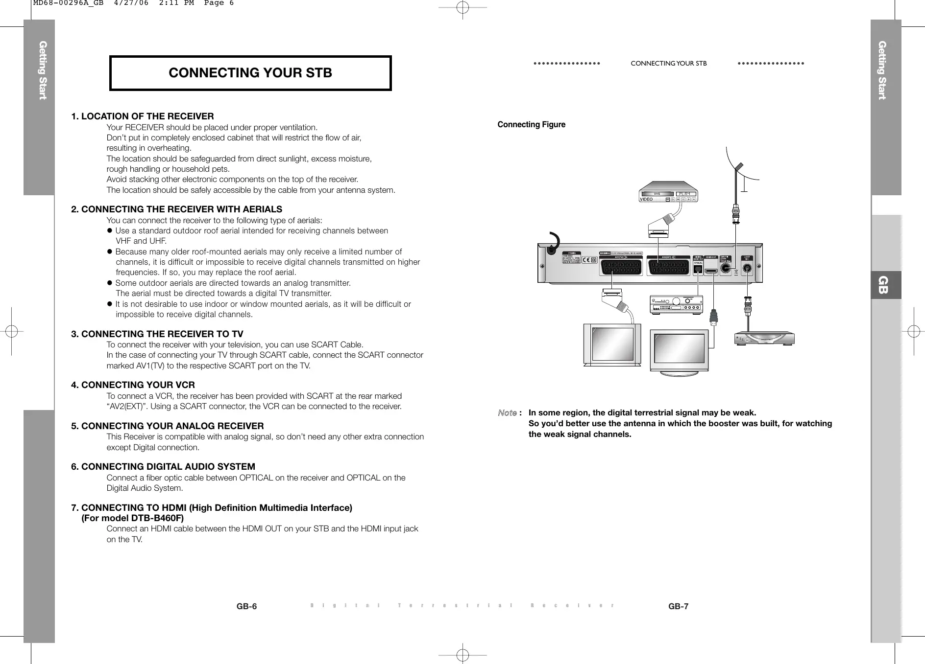 To connect a VCR, the receiver has been provided with SCART at the rear marked “AV2(EXT)”. Using a SCART connector, the VCR can be connected to the receiver. Note : In some region, the digital terrestrial signal may be weak. So you’d better use the antenna in which the booster was built, for watching the weak signal channels.