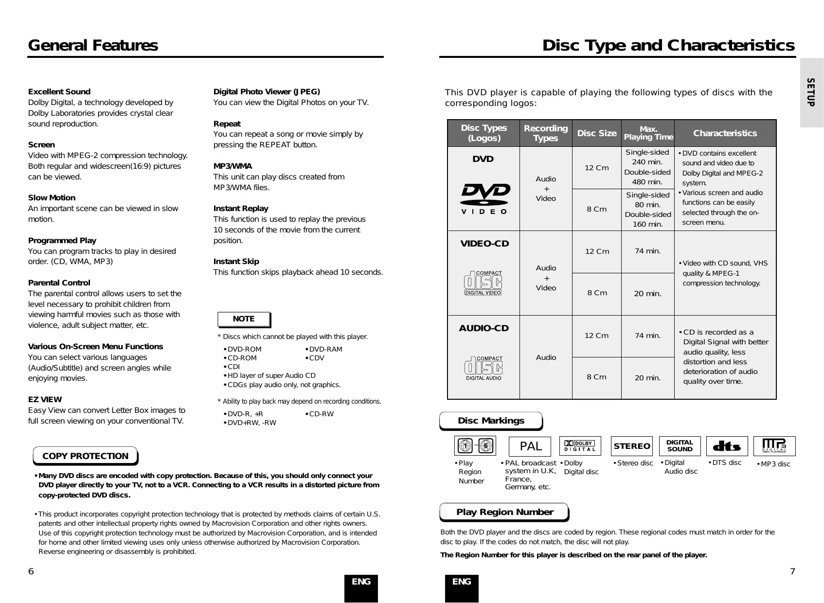 - Discs which cannot be played with this player. Various On-Screen Menu Functions You can select various languages (Audio/Subtitle) and screen angles while enjoying movies. This DVD player is capable of playing the following types of discs with the corresponding logos: MP3/WMA This unit can play discs created from MP3/WMA files. Instant Replay This function is used to replay the previous 10 seconds of the movie from the current position. SETUP Excellent Sound Dolby Digital, a technology developed by Dolby Laboratories provides crystal clear sound reproduction. Disc Type and Characteristics AUDIO-CD