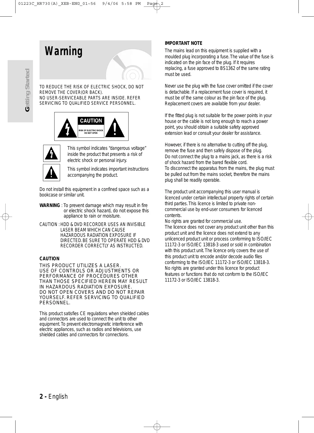 - Do not place the HDD & DVD RECORDER in a location subject to mechanical vibrations or in an unstable location. English - 3 Getting Started Important Safety Instructions Handling Cautions Getting Started