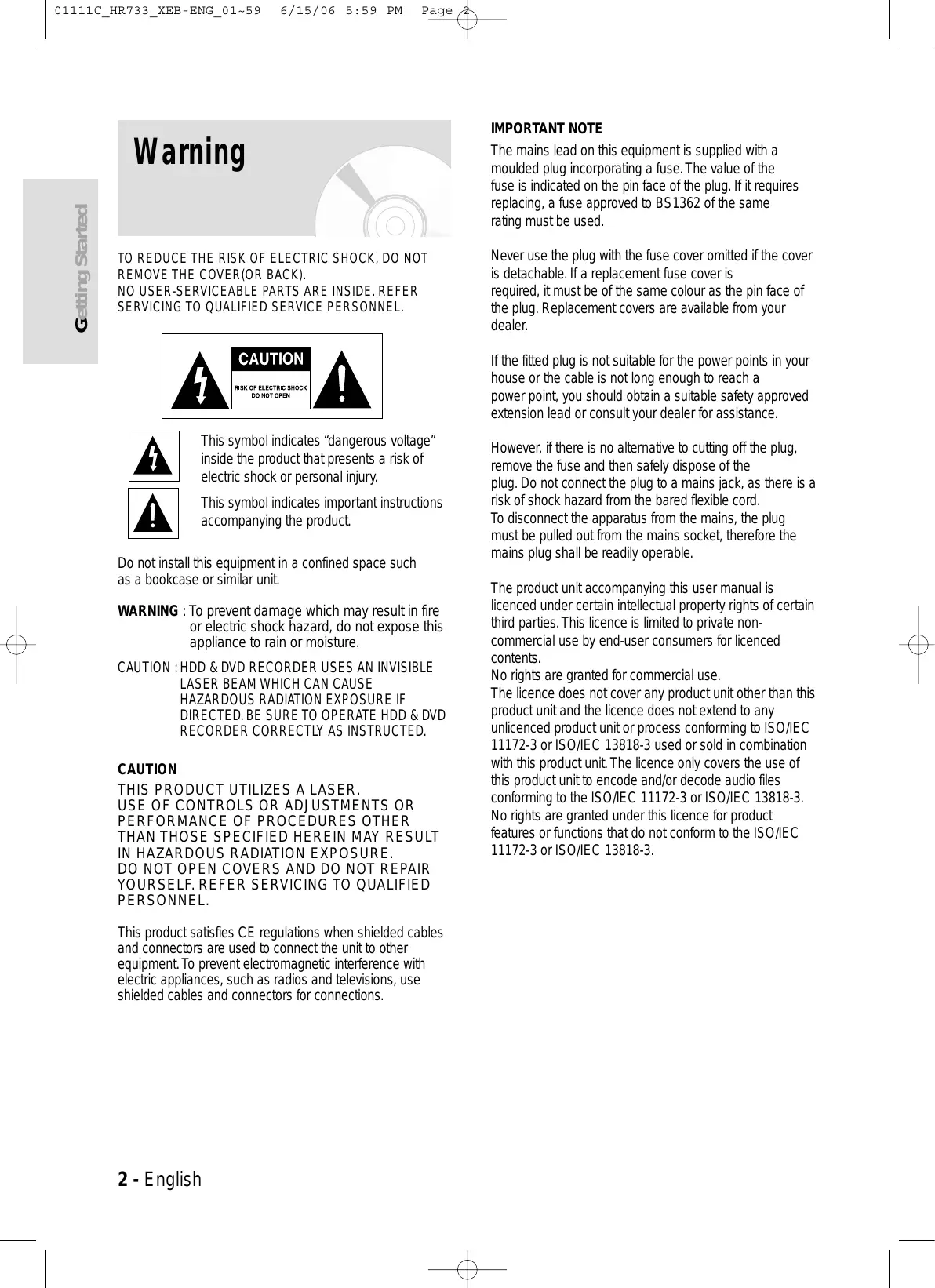 This symbol indicates “dangerous voltage” inside the product that presents a risk of electric shock or personal injury. This symbol indicates important instructions accompanying the product. Do not install this equipment in a confined space such as a bookcase or similar unit. WARNING : To prevent damage which may result in fire or electric shock hazard, do not expose this appliance to rain or moisture. CAUTION : HDD & DVD RECORDER USES AN INVISIBLE LASER BEAM WHICH CAN CAUSE HAZARDOUS RADIATION EXPOSURE IF DIRECTED. BE SURE TO OPERATE HDD & DVD RECORDER CORRECTLY AS INSTRUCTED. CAUTION THIS PRODUCT UTILIZES A LASER. USE OF CONTROLS OR ADJUSTMENTS OR PERFORMANCE OF PROCEDURES OTHER THAN THOSE SPECIFIED HEREIN MAY RESULT IN HAZARDOUS RADIATION EXPOSURE. DO NOT OPEN COVERS AND DO NOT REPAIR YOURSELF. REFER SERVICING TO QUALIFIED PERSONNEL. This product satisfies CE regulations when shielded cables and connectors are used to connect the unit to other equipment. To prevent electromagnetic interference with electric appliances, such as radios and televisions, use shielded cables and connectors for connections.