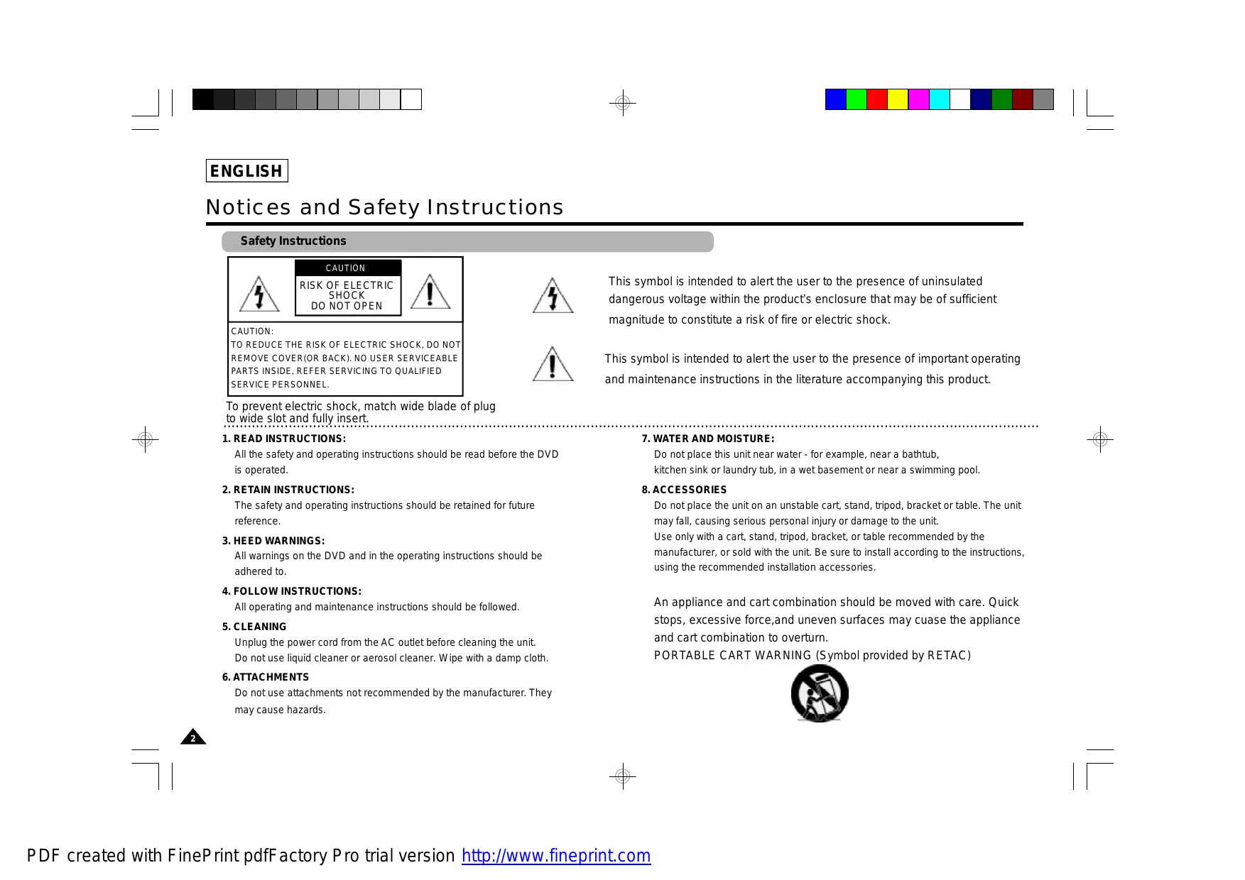 PDF created with FinePrint pdfFactory Pro trial version http://www.fineprint.com An appliance and cart combination should be moved with care. Quick stops, excessive force,and uneven surfaces may cuase the appliance and cart combination to overturn. PORTABLE CART WARNING (Symbol provided by RETAC) ENGLISH Notices and Safety Instructions