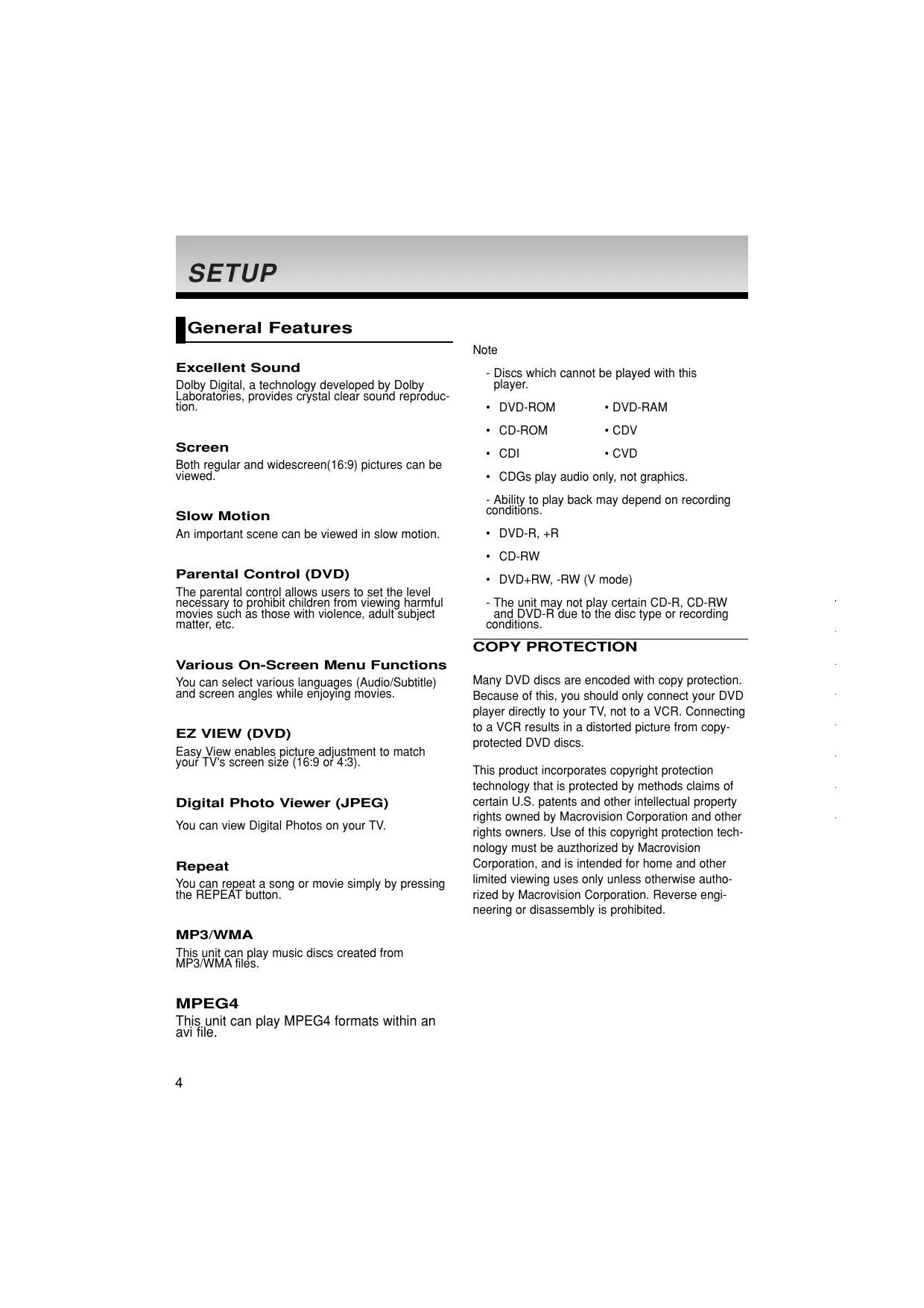 - DVD+RW, -RW (V mode) - The unit may not play certain CD-R, CD-RW and DVD-R due to the disc type or recording conditions. COPY PROTECTION Various On-Screen Menu Functions You can select various languages (Audio/Subtitle) and screen angles while enjoying movies. EZ VIEW (DVD) Easy View enables picture adjustment to match your TV's screen size (16:9 or 4:3). Digital Photo Viewer (JPEG) You can view Digital Photos on your TV. Repeat You can repeat a song or movie simply by pressing the REPEAT button. MP3/WMA This unit can play music discs created from MP3/WMA files. MPEG4 This unit can play MPEG4 formats within an avi file.
