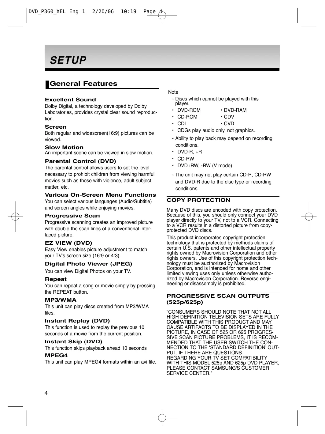 English DVD_P360_XEL Eng 1 DVD_P360_XEL Eng 1 2/20/06 10:19 Page 4 SETUP General Features Excellent Sound Dolby Digital, a technology developed by Dolby Laboratories, provides crystal clear sound reproduction. Screen Both regular and widescreen(16:9) pictures can be viewed. Slow Motion An important scene can be viewed in slow motion. Parental Control (DVD) The parental control allows users to set the level necessary to prohibit children from viewing harmful movies such as those with violence, adult subject matter, etc. Various On-Screen Menu Functions You can select various languages (Audio/Subtitle) and screen angles while enjoying movies. Progressive Scan Progressive scanning creates an improved picture with double the scan lines of a conventional interlaced picture. EZ VIEW (DVD) Easy View enables picture adjustment to match your TV's screen size (16:9 or 4:3). Digital Photo Viewer (JPEG) You can view Digital Photos on your TV. Repeat You can repeat a song or movie simply by pressing the REPEAT button. MP3/WMA This unit can play discs created from MP3/WMA files. Instant Replay (DVD) This function is used to replay the previous 10 seconds of a movie from the current position. Instant Skip (DVD) This function skips playback ahead 10 seconds MPEG4 This unit can play MPEG4 formats within an avi file.