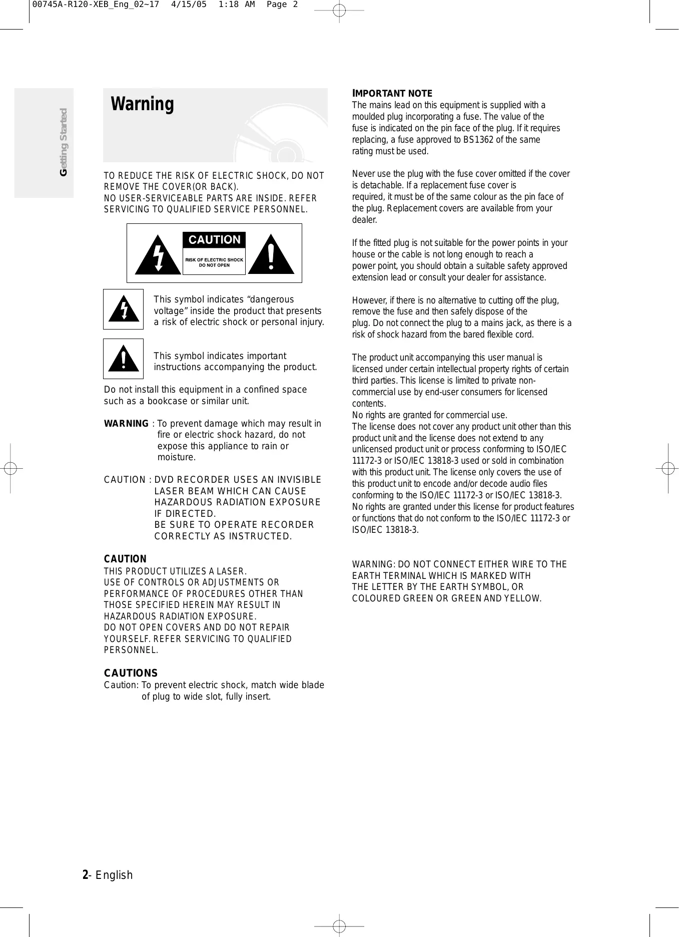 SERVICING TO QUALIFIED SERVICE PERSONNEL. IMPORTANT NOTE The mains lead on this equipment is supplied with a moulded plug incorporating a fuse. The value of the fuse is indicated on the pin face of the plug. If it requires replacing, a fuse approved to BS1362 of the same rating must be used. Never use the plug with the fuse cover omitted if the cover is detachable. If a replacement fuse cover is required, it must be of the same colour as the pin face of the plug. Replacement covers are available from your dealer. If the fitted plug is not suitable for the power points in your house or the cable is not long enough to reach a power point, you should obtain a suitable safety approved extension lead or consult your dealer for assistance. This symbol indicates “dangerous voltage” inside the product that presents a risk of electric shock or personal injury. However, if there is no alternative to cutting off the plug, remove the fuse and then safely dispose of the plug. Do not connect the plug to a mains jack, as there is a risk of shock hazard from the bared flexible cord. This symbol indicates important instructions accompanying the product. The product unit accompanying this user manual is licensed under certain intellectual property rights of certain third parties. This license is limited to private noncommercial use by end-user consumers for licensed contents. No rights are granted for commercial use. The license does not cover any product unit other than this product unit and the license does not extend to any unlicensed product unit or process conforming to ISO/IEC 11172-3 or ISO/IEC 13818-3 used or sold in combination with this product unit. The license only covers the use of this product unit to encode and/or decode audio files conforming to the ISO/IEC 11172-3 or ISO/IEC 13818-3. No rights are granted under this license for product features or functions that do not conform to the ISO/IEC 11172-3 or ISO/IEC 13818-3. Do not install this equipment in a confined space such as a bookcase or similar unit.