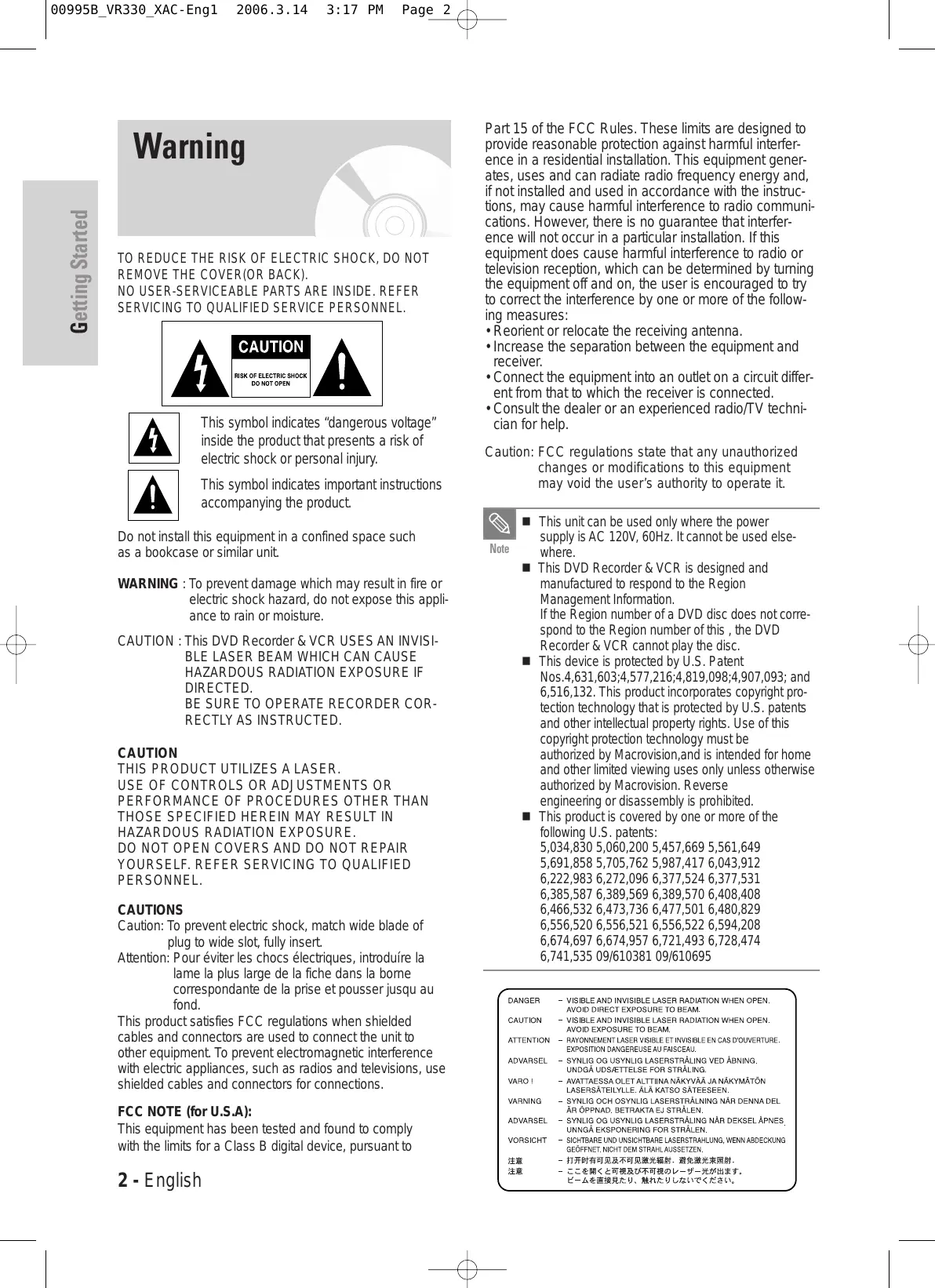 à l’intérieur du produit représente un risque de choc électrique ou de blessure corporelle. Ce symbole signifie que des instructions importantes accompagnent le produit. N’installez pas cet équipement dans un espace réduit comme une bibliothèque ou un meuble de ce type. AVERTISSEMENT : Pour éviter tout dommage pouvant causer un incendie ou une électrocution, n’exposez pas cet appareil à la pluie ni à une humidité excessive. ATTENTION : LES ENREGISTREURS DVD AVEC MAGNÉTOSCOPES UTILISENT UN FAISCEAU LASER QUI PEUT REPRÉSENTER UNE SOURCE DANGEREUSE D’EXPOSITION AUX RAYONNEMENTS LORSQU’ELLE EST DIRIGÉE VERS LES PERSONNES. RESPECTEZ LES INSTRUCTIONS AFIN D’UTILISER L’ENREGISTREUR EN TOUTE CONFORMITÉ. ATTENTION CE PRODUIT COMPORTE UN LASER. L’UTILISATION DE COMMANDES, DE RÉGLAGES OU DE PROCÉDURES DE FONCTIONNEMENT AUTRES QUE CELLES INDIQUÉES DANS LES PRÉSENTES INSTRUCTIONS PEUT REPRÉSENTERUNE SOURCE DANGEREUSE D’EXPOSITION AUX RAYONNEMENTS. N’OUVREZ PAS LE BOÎTIER ET NE RÉPAREZ PAS VOUSMÊME L'APPAREIL. CONFIEZ LES RÉPARATIONS À UN TECHNICIEN QUALIFIÉ. MISE EN GARDE Attention: Pour éviter les chocs électriques, introduisez entièrement la lame la plus large de la fiche dans la borne correspondante de la prise. Attention: Pour éviter les chocs électriques, introduíre la lame la plus large de la fiche dans la borne correspondante de la prise et pousser jusqu au fond. Cet appareil est conforme à la réglementation de la FCC (Commission fédérale des communications des États-Unis) lorsqu’il est branché à d’autres équipements à l’aide de câbles et de connecteurs blindés. N’utilisez que des câbles et des connecteurs blindés afin d’éviter toute interférence électromagnétique avec d’autres appareils électriques comme un téléviseur ou une radio.