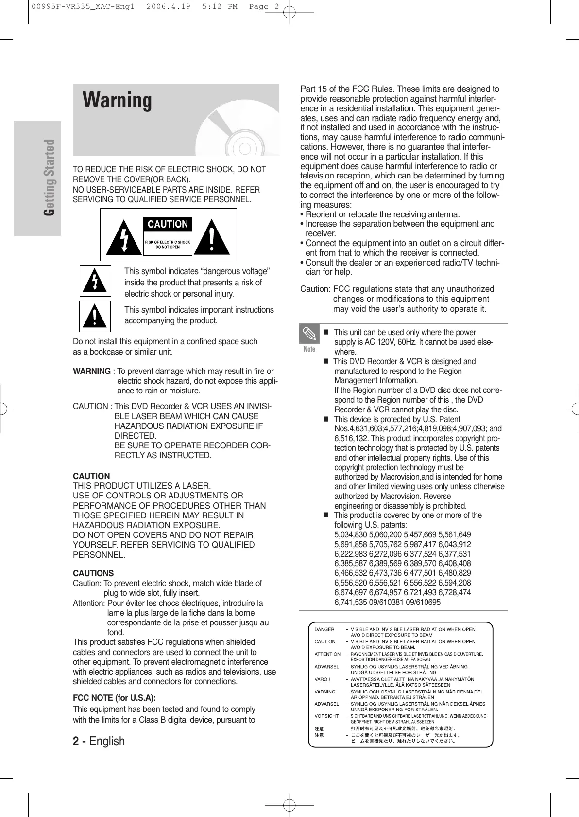 Part 15 of the FCC Rules. These limits are designed to provide reasonable protection against harmful interference in a residential installation. This equipment generates, uses and can radiate radio frequency energy and, if not installed and used in accordance with the instructions, may cause harmful interference to radio communications. However, there is no guarantee that interference will not occur in a particular installation. If this equipment does cause harmful interference to radio or television reception, which can be determined by turning the equipment off and on, the user is encouraged to try to correct the interference by one or more of the following measures: • Reorient or relocate the receiving antenna. • Increase the separation between the equipment and receiver. • Connect the equipment into an outlet on a circuit different from that to which the receiver is connected. • Consult the dealer or an experienced radio/TV technician for help. Caution: FCC regulations state that any unauthorized changes or modifications to this equipment may void the user’s authority to operate it. This unit can be used only where the power supply is AC 120V, 60Hz. It cannot be used elseNote where. This DVD Recorder & VCR is designed and manufactured to respond to the Region Management Information. If the Region number of a DVD disc does not correspond to the Region number of this , the DVD Recorder & VCR cannot play the disc. This device is protected by U.S. Patent Nos.4,631,603;4,577,216;4,819,098;4,907,093; and 6,516,132. This product incorporates copyright protection technology that is protected by U.S. patents and other intellectual property rights. Use of this copyright protection technology must be authorized by Macrovision,and is intended for home and other limited viewing uses only unless otherwise authorized by Macrovision. Reverse engineering or disassembly is prohibited. This product is covered by one or more of the following U.S. patents: 5,034,830 5,060,200 5,457,669 5,561,649 5,691,858 5,705,762 5,987,417 6,043,912 6,222,983 6,272,096 6,377,524 6,377,531 6,385,587 6,389,569 6,389,570 6,408,408 6,466,532 6,473,736 6,477,501 6,480,829 6,556,520 6,556,521 6,556,522 6,594,208 6,674,697 6,674,957 6,721,493 6,728,474 6,741,535 09/610381 09/610695