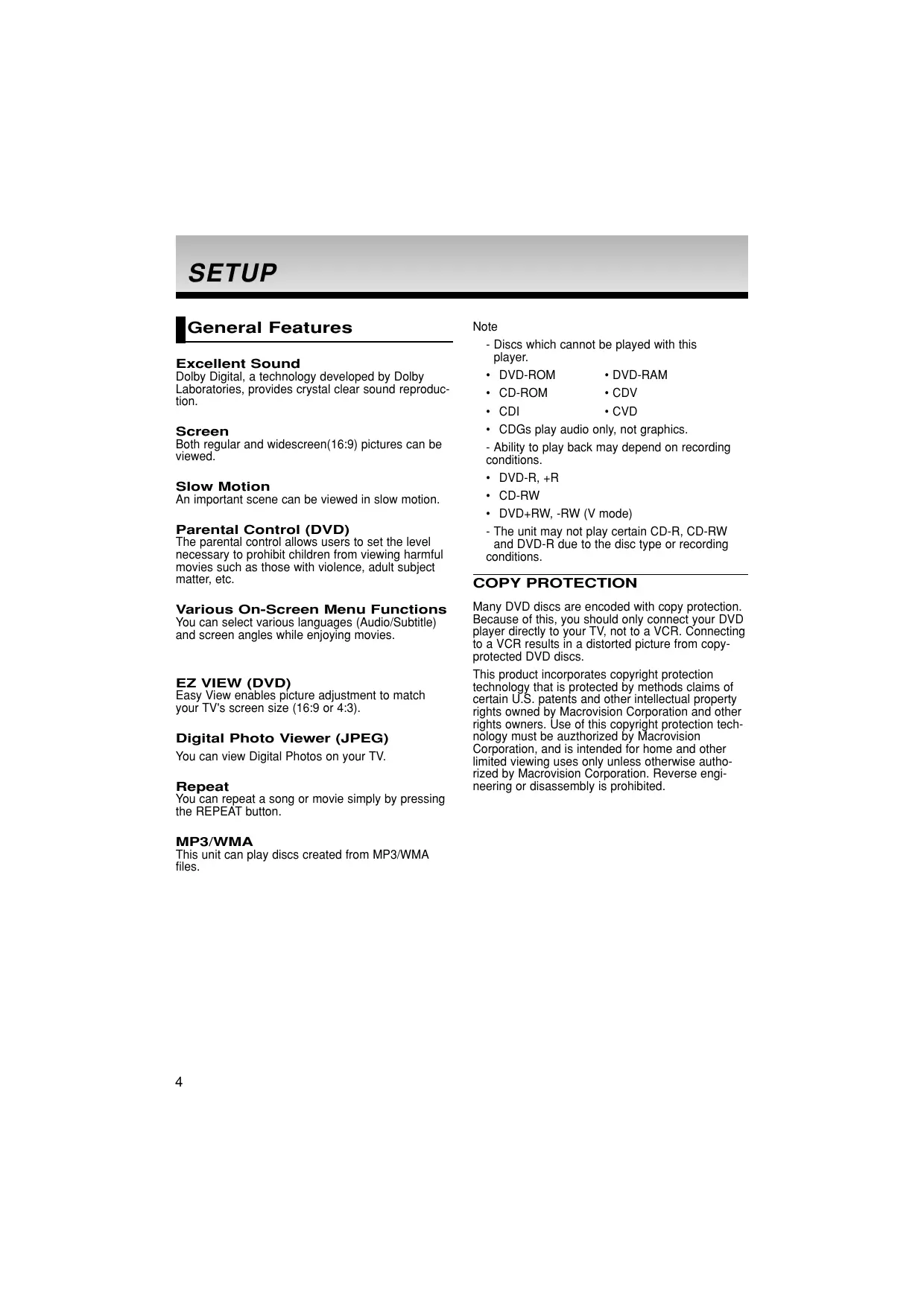 English SETUP General Features Excellent Sound Dolby Digital, a technology developed by Dolby Laboratories, provides crystal clear sound reproduction. Screen Both regular and widescreen(16:9) pictures can be viewed. Slow Motion An important scene can be viewed in slow motion. Parental Control (DVD) The parental control allows users to set the level necessary to prohibit children from viewing harmful movies such as those with violence, adult subject matter, etc. Various On-Screen Menu Functions You can select various languages (Audio/Subtitle) and screen angles while enjoying movies. EZ VIEW (DVD) Easy View enables picture adjustment to match your TV's screen size (16:9 or 4:3). Digital Photo Viewer (JPEG) You can view Digital Photos on your TV. Repeat You can repeat a song or movie simply by pressing the REPEAT button. MP3/WMA This unit can play discs created from MP3/WMA files.