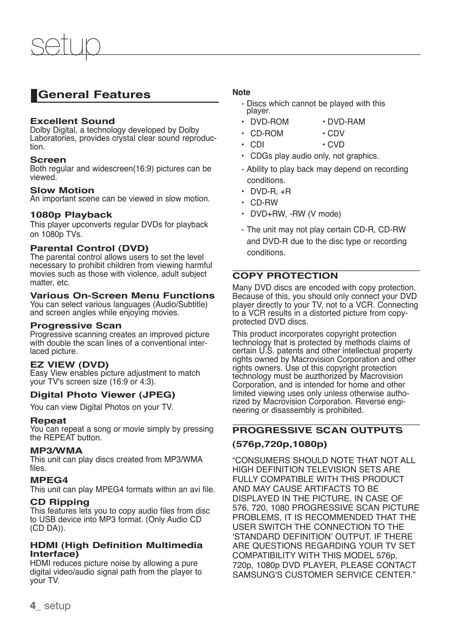 - Specifications English _ setup General Features Excellent Sound Dolby Digital, a technology developed by Dolby Laboratories, provides crystal clear sound reproduction. Screen Both regular and widescreen(16:9) pictures can be viewed. Slow Motion An important scene can be viewed in slow motion. 1080p Playback This player upconverts regular DVDs for playback on 1080p TVs. Parental Control (DVD) The parental control allows users to set the level necessary to prohibit children from viewing harmful movies such as those with violence, adult subject matter, etc. Various On-Screen Menu Functions You can select various languages (Audio/Subtitle) and screen angles while enjoying movies. Progressive Scan Progressive scanning creates an improved picture with double the scan lines of a conventional interlaced picture. EZ VIEW (DVD) Easy View enables picture adjustment to match your TV's screen size (16:9 or 4:3). Digital Photo Viewer (JPEG) You can view Digital Photos on your TV. Repeat You can repeat a song or movie simply by pressing the REPEAT button. MP3/WMA This unit can play discs created from MP3/WMA files. MPEG4 This unit can play MPEG4 formats within an avi file. CD Ripping This features lets you to copy audio files from disc to USB device into MP3 format. (Only Audio CD (CD DA)). HDMI (High Definition Multimedia Interface) HDMI reduces picture noise by allowing a pure digital video/audio signal path from the player to your TV. _ setup Note - Discs which cannot be played with this player. p. 37