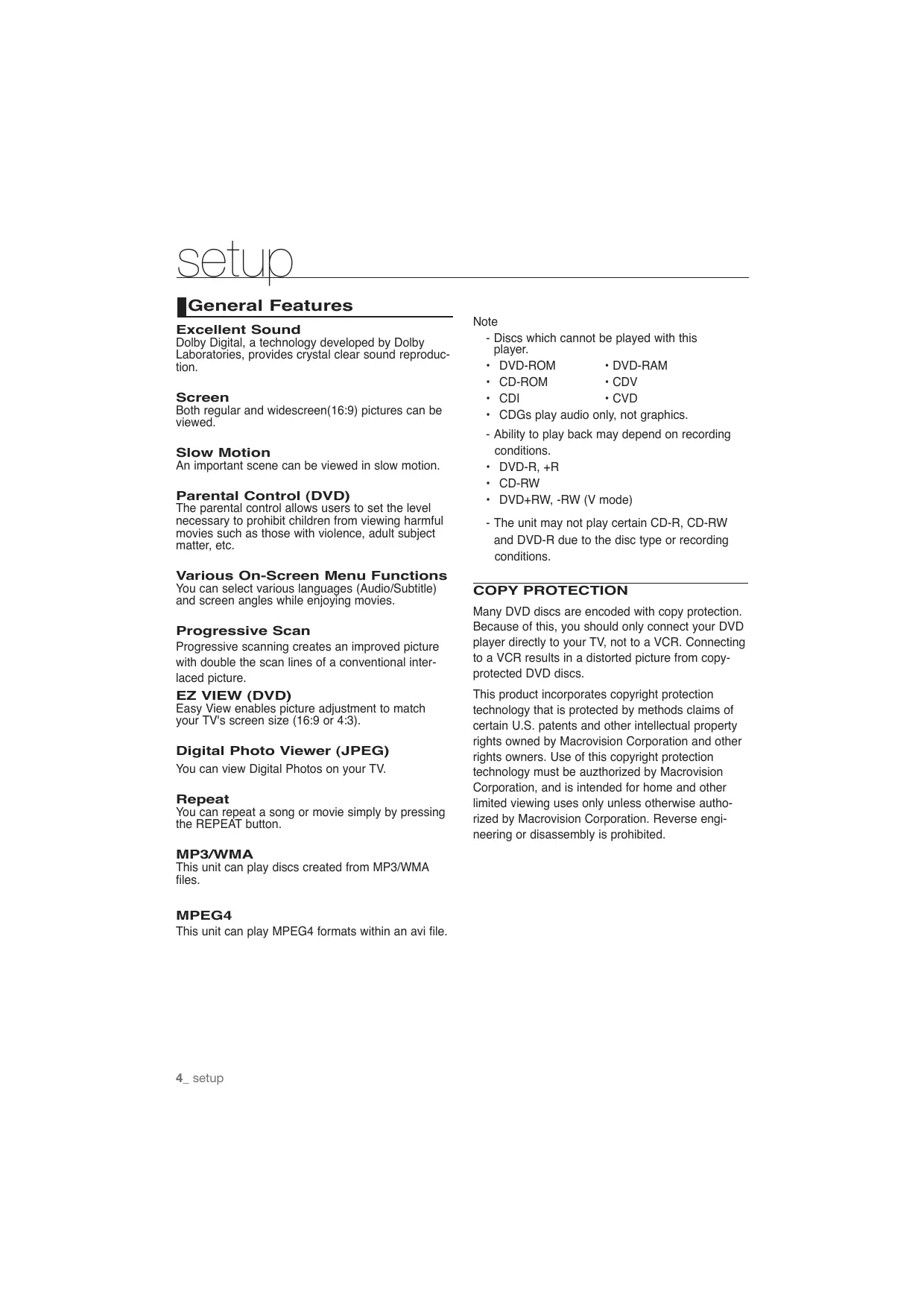 - product is not user replaceable. Specifications - For information on its replacement, please contact your service provider. English _3 setup General Features Excellent Sound Dolby Digital, a technology developed by Dolby Laboratories, provides crystal clear sound reproduction. Screen Both regular and widescreen(16:9) pictures can be viewed. Slow Motion An important scene can be viewed in slow motion. Parental Control (DVD) The parental control allows users to set the level necessary to prohibit children from viewing harmful movies such as those with violence, adult subject matter, etc. Various On-Screen Menu Functions You can select various languages (Audio/Subtitle) and screen angles while enjoying movies. Progressive Scan Progressive scanning creates an improved picture with double the scan lines of a conventional interlaced picture. EZ VIEW (DVD) Easy View enables picture adjustment to match your TV's screen size (16:9 or 4:3). Digital Photo Viewer (JPEG) You can view Digital Photos on your TV. Repeat You can repeat a song or movie simply by pressing the REPEAT button. MP3/WMA This unit can play discs created from MP3/WMA files. MPEG4 This unit can play MPEG4 formats within an avi file. 4_ setup Note - Discs which cannot be played with this player. p. 31