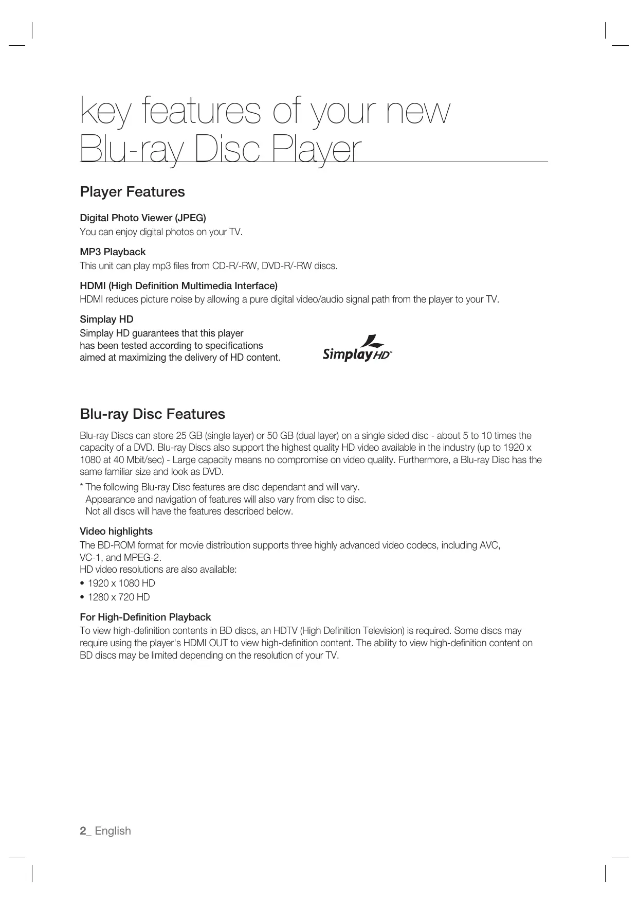 - 1280 x 720 HD For High-Definition Playback To view high-definition contents in BD discs, an HDTV (High Definition Television) is required. Some discs may require using the player's HDMI OUT to view high-definition content. The ability to view high-definition content on BD discs may be limited depending on the resolution of your TV. 2_ English Graphic planes Two individual, full HD resolution (1920x1080) video layers are available, on top of the HD video layer. One layer is assigned to video-related graphics (like subtitles), and the other layer is assigned to interactive elements, such as buttons or menus. Various wipes, fades and scroll effects may be available on both layers. PLAY MOVIE LANGUAGES SCENE SELECTIONS PREVIEWS Graphic Planes