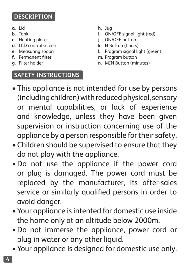únicamente el asa de la jarra de cristal durante la fase de calentamiento y hasta que se enfríe. • Los niños menores de 8 años podrán utilizar el aparato siempre bajo supervisión, si han recibido instrucciones sobre el uso del aparato